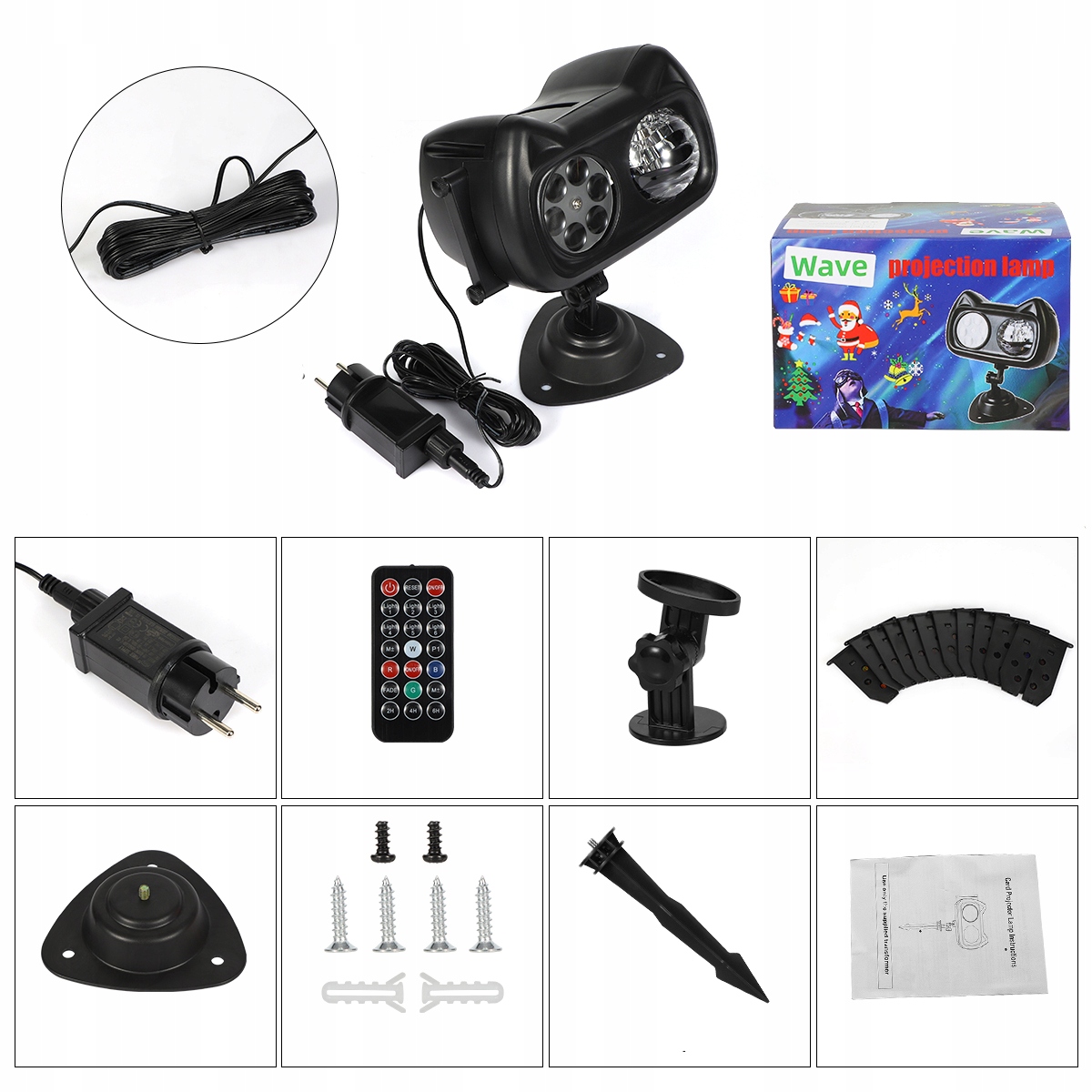 Зовнішній проектор оснащений двома проекціями, одна для ефекту RGBW Aurora, а другий для проекції зображень шаблонів. Останні 12 різних барвистих слайдів дизайну з 10 різними кольорами ефекту Аврори на Різдво та день народження.