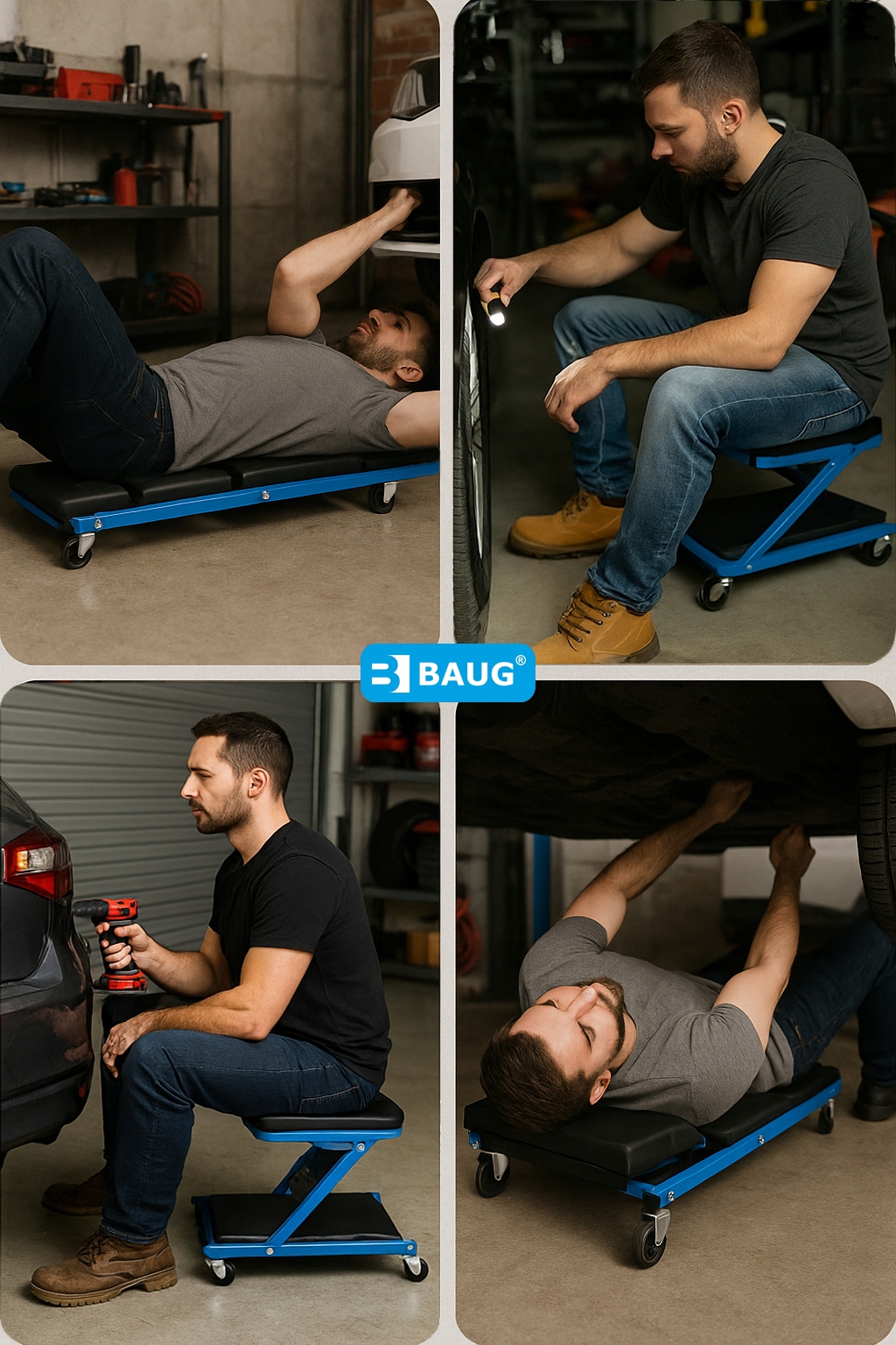 2in1 Waug Worktop для професійних семінарів та автомобільних послуг та для передових аматорів. Диван з функцією семінару 2 в 1, яка дозволяє працювати у двох позиціях: сидіти і брехати. Рама виготовлена ​​з металу, а сидіння - від доброзичливого та міцного пластику. Він оснащений 6 поворотними колесами, що значно полегшує маневрування. За допомогою одного руху ви можете перетворити його на практичне та зручне сидіння для майстерні.