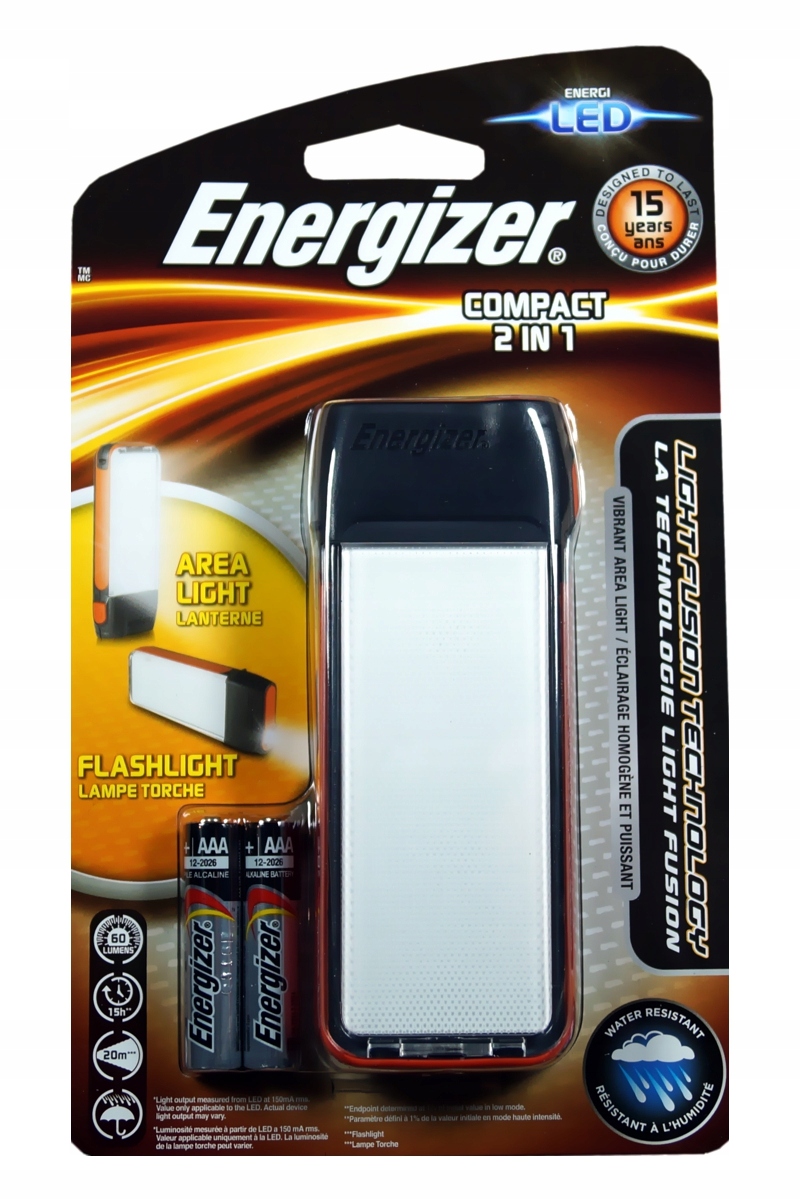 Energizer® Compact 2-in-1 використовує інноваційну технологію Light Fusion, що забезпечує освітлення місцевості та точкове освітлення в одному невеликому універсальному продукті . Завдяки своїй тонкій і легкій конструкції він легко поміститься в кишеню, ящик або бардачок автомобіля. Водонепроникний корпус означає, що ліхтарик не підведе вас за будь-яких умов.
