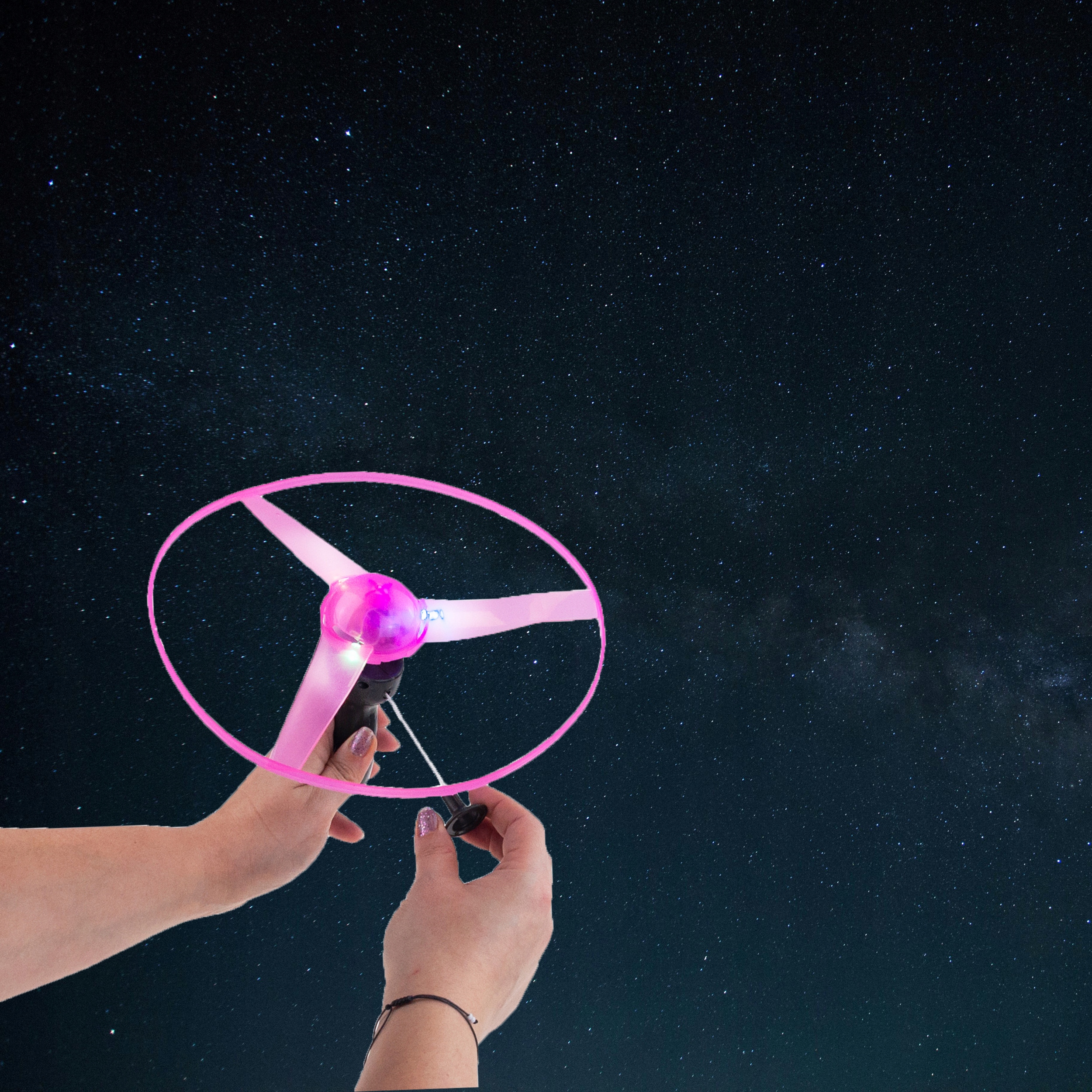 ☑ Ми ставимо кільце на ручку, ми потягуємо струну енергійно, а потім світиться кільце піднімається високо вгору. {до 14 метрів}.
