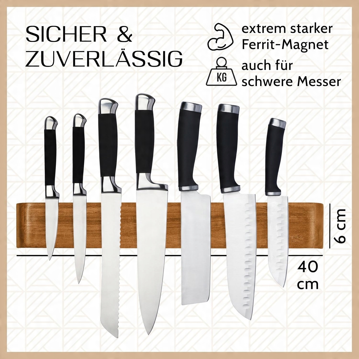 - Найвища безпека - дуже сильні феритові магніти всередині магнітної ручки також підтримують надзвичайно важкі та великі ножі безпечним та надійним способом. Розміри: 40 х 6 х 1,9 см.