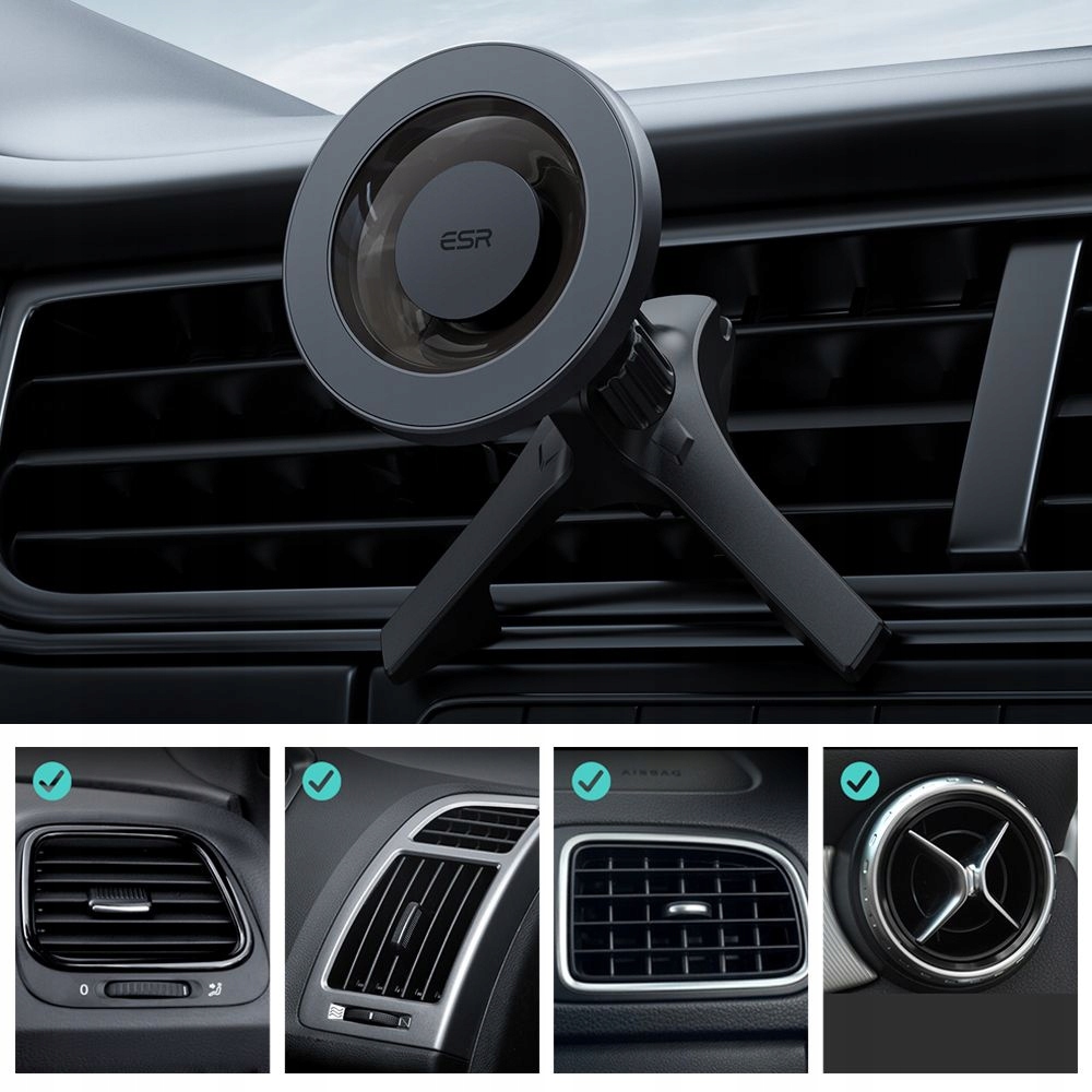 ESR Halolock підтримує всі типи вентиляційні отвори автомобіля. Завдяки монтажу гачка, його можна прикріпити до будь-якого типу решітки. Крім того, цей гачок можна обертати, тож навіть за вертикального потоку повітря його можна повернути на 90° і встановити стабільно.