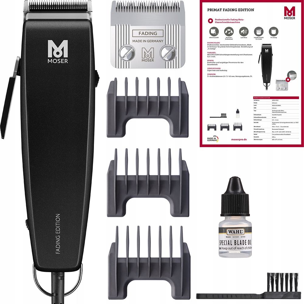 Moser Primat PRO 1230 Fading Edition Це машинка для стрижки, призначена для безперервної роботи з осцилюючим поляризований двигун 15 Вт (3000 об/хв) і постійна швидкість, а функція MultiClick® має 5 налаштувань різання леза в діапазоні від 0,5 мм до 2 мм + 3 додаткові кришки