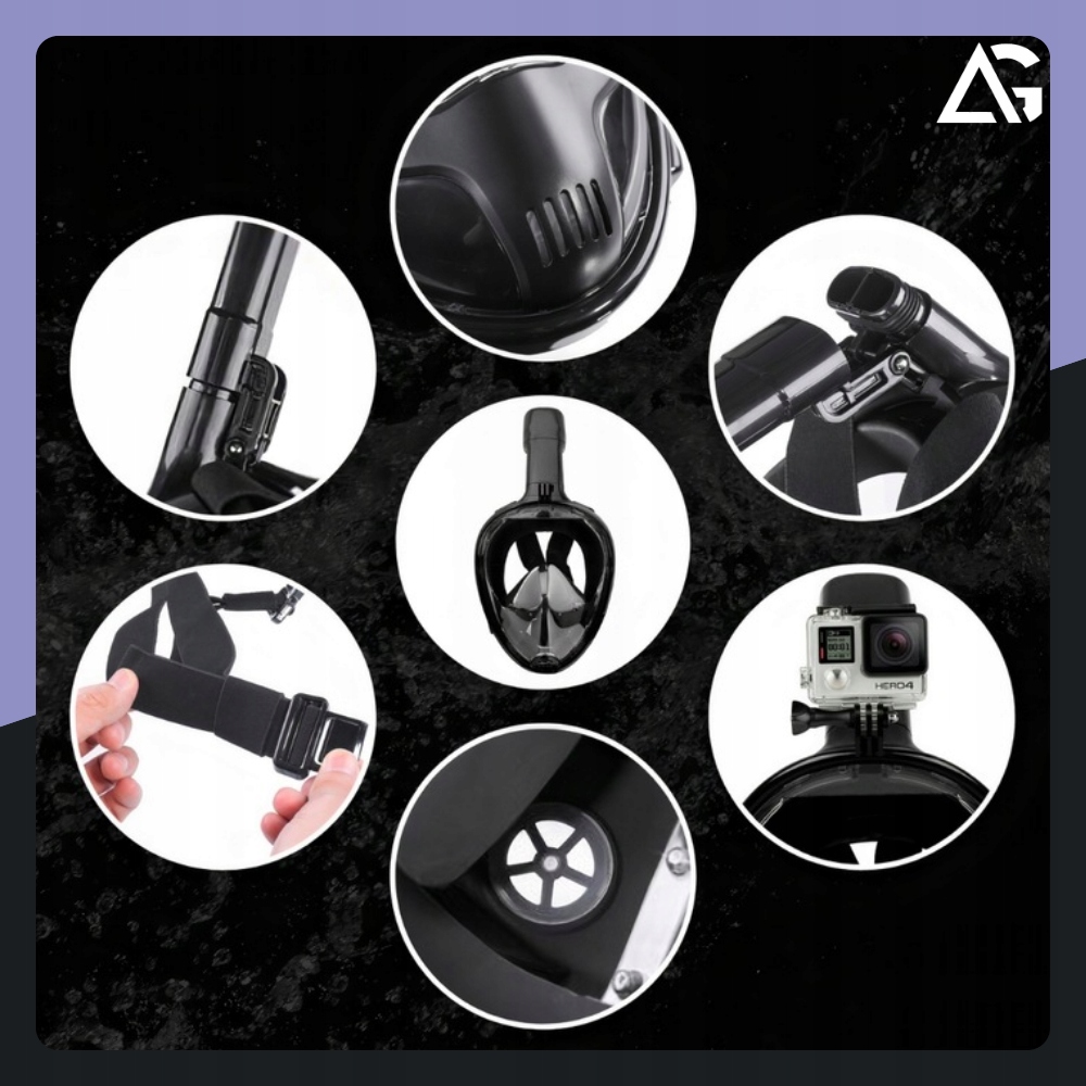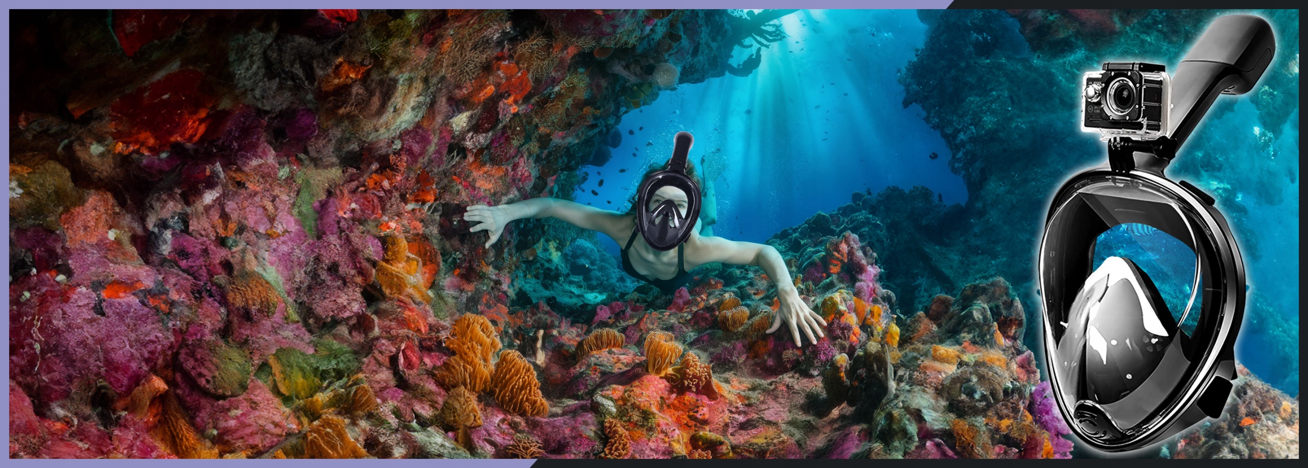 Маска для дайвінгу в повному місці оснащена практичною ручкою для спортивної камери, яка дозволяє зареєструвати кожен спуск під водою з точки зору першої особи.