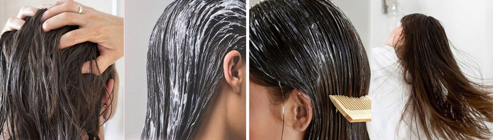 - Вимийте волосся улюбленим шампунем, а потім рівномірно розкладіть рідину по всій довжині волосся. Рідка сумішшю негайно перетвориться на густу маску.