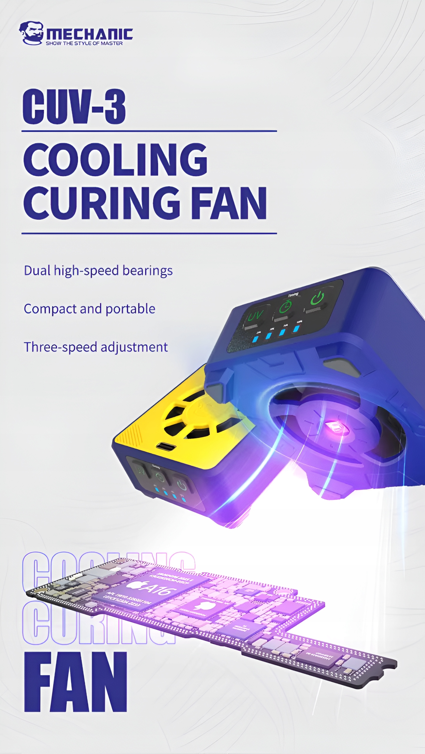 вдосконалена УФ-лампа з вентилятором використовується в основному для ультрафіолетової фарби в електроніці та косметиці. Електронне, де потрібно швидке затвердіння клеїв, лаків або УФ -смол