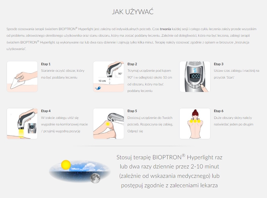 Простий у використанні та абсолютно безпечний, глибоко проникаючий гіперполяризований медичний прилад призначений для домашнього використання, але також може бути робочим інструментом для професіоналів у лікарнях , клініки, спортивні та оздоровчі центри. Усі прилади для світлотерапії BIOPTRON є 100% безпечними та не містять ультрафіолетового випромінювання в спектрі світла, який використовується під час терапії.