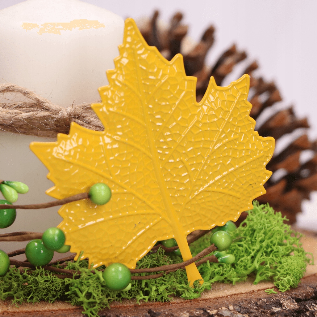 Підвіска з кленового листка з отвором на ніжці стане ідеальним доповненням до будь-яких осінніх композицій. Добре підійде як для вінків, так і для розвішування на гілках. Він виготовлений із міцного металу та має гарну блискучу поверхню.