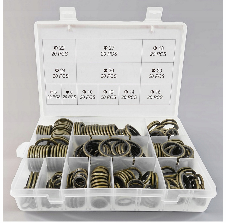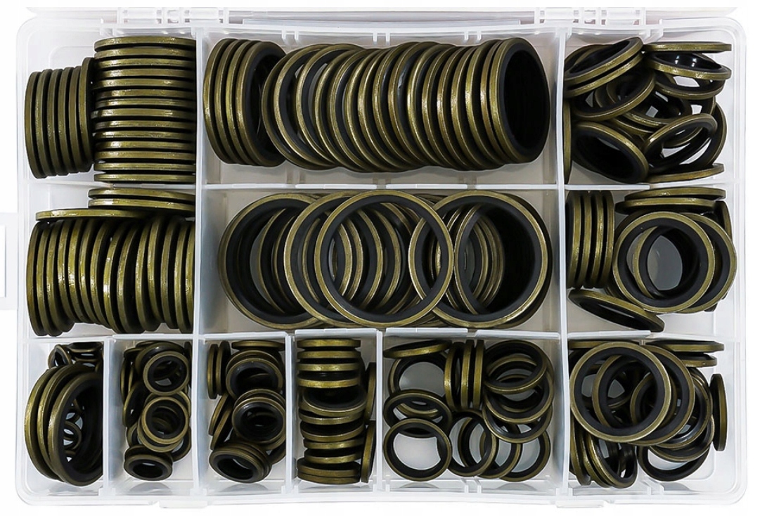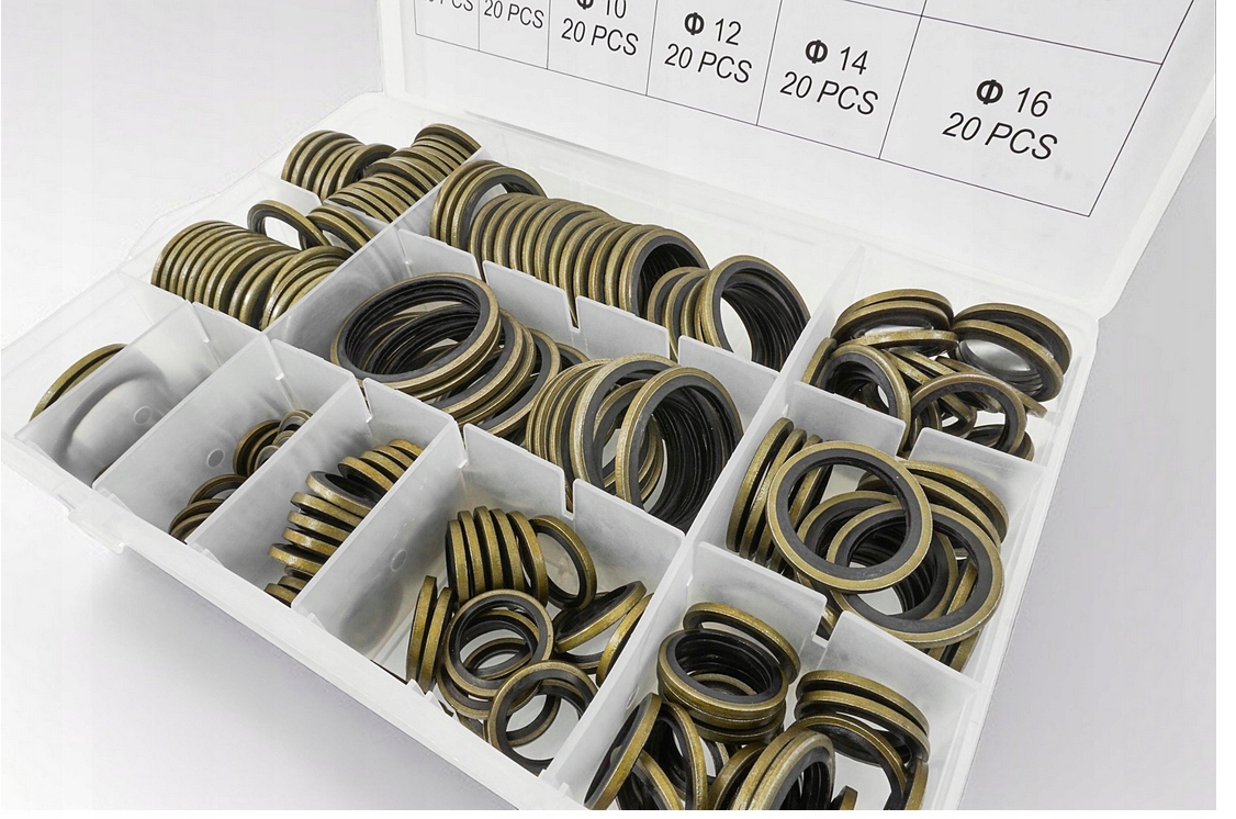 Набір металевих прокладок ущільнювальних прокладок у розмірах від M6 до M30. Виготовлені з металу та гуми мають хороші ущільнювальні властивості, вони стійкі до високого тиску та олії.