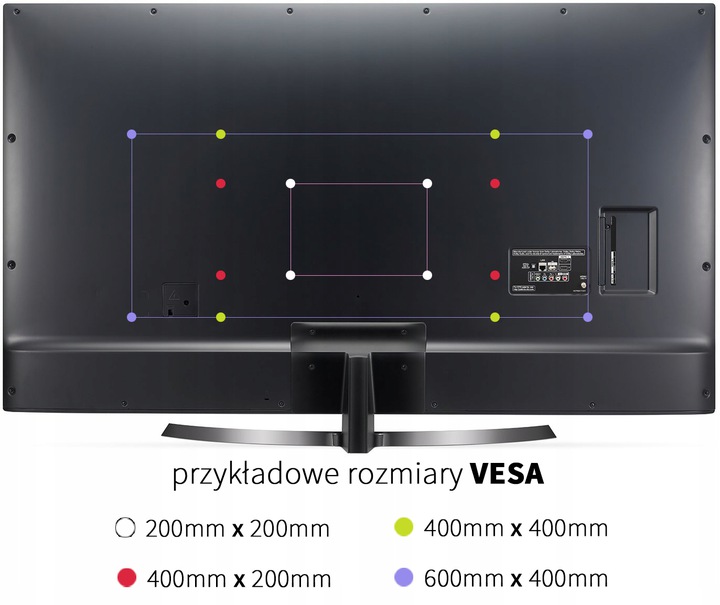 - Стандарт VESA (стандарти відеоелектроніки) Association) - це стандарт кріплення, який інформує, яку відстань між монтажними отворами має мати вішалка, на яку ми хочемо повісити телевізор. Тип отворів перевірити дуже просто: це описано в інструкції. Якщо ця інформація недоступна, ви можете самостійно виміряти відстань між монтажними отворами на задній панелі телевізора. Найпоширеніші: VESA 200 x 200, VESA 100 x 100, VESA 300 x 300, VESA 400 x 400, VESA 600 x 400, де перше число визначає відстань між лівим і правим отворами в одному ряду (по горизонталі)