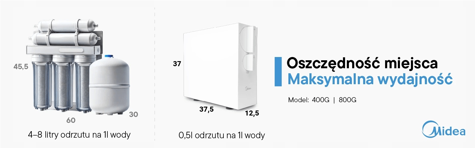 MIDEA 400GPD економить воду - лише 1 літр віддачі на 2 літри чисті! Нижчі рахунки, менше споживання та нульові відходи. Екологічна альтернатива класичному перевернутому осмосу.