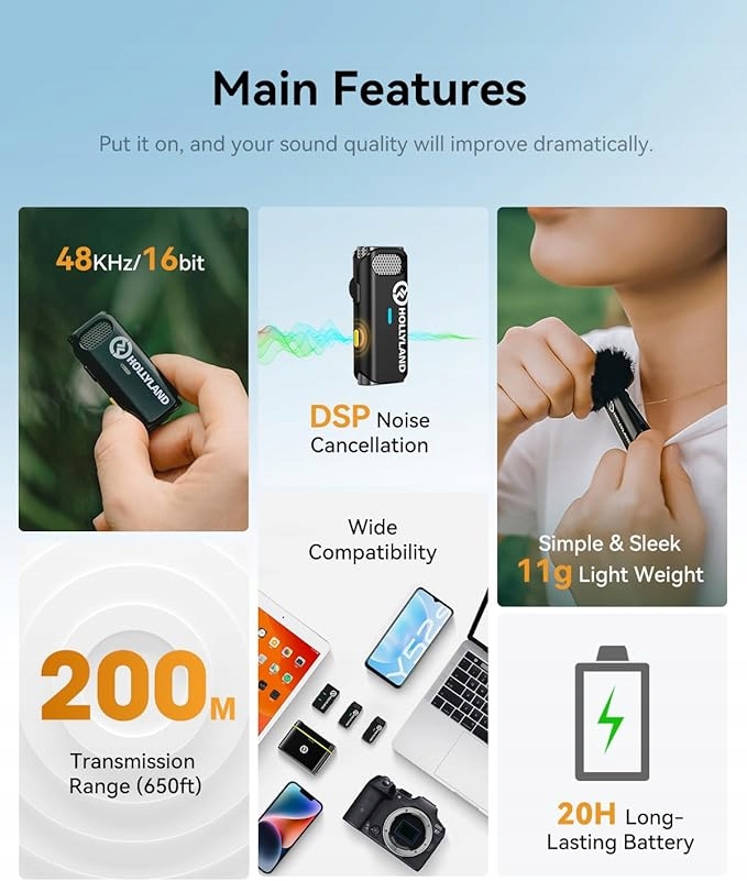 Hollyland Lark M1 Duo wireless microphone is an ideal solution for youtubers, vloggers and people conducting broadcasting people Live, which value high sound якість. Завдяки компактному та елегантному корпусу мікрофон збирає звук з усіх напрямків, забезпечуючи відмінну якість записів.
