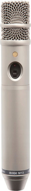 røde nt3 є ємнісним мікрофоном з вставкою з діаметром 3/4 дюйма, призначеним для роботи в студії, на сцені та в полі. Мікрофон можна поляризувати за допомогою стандартної напруги фантомів та батарей 9 В.