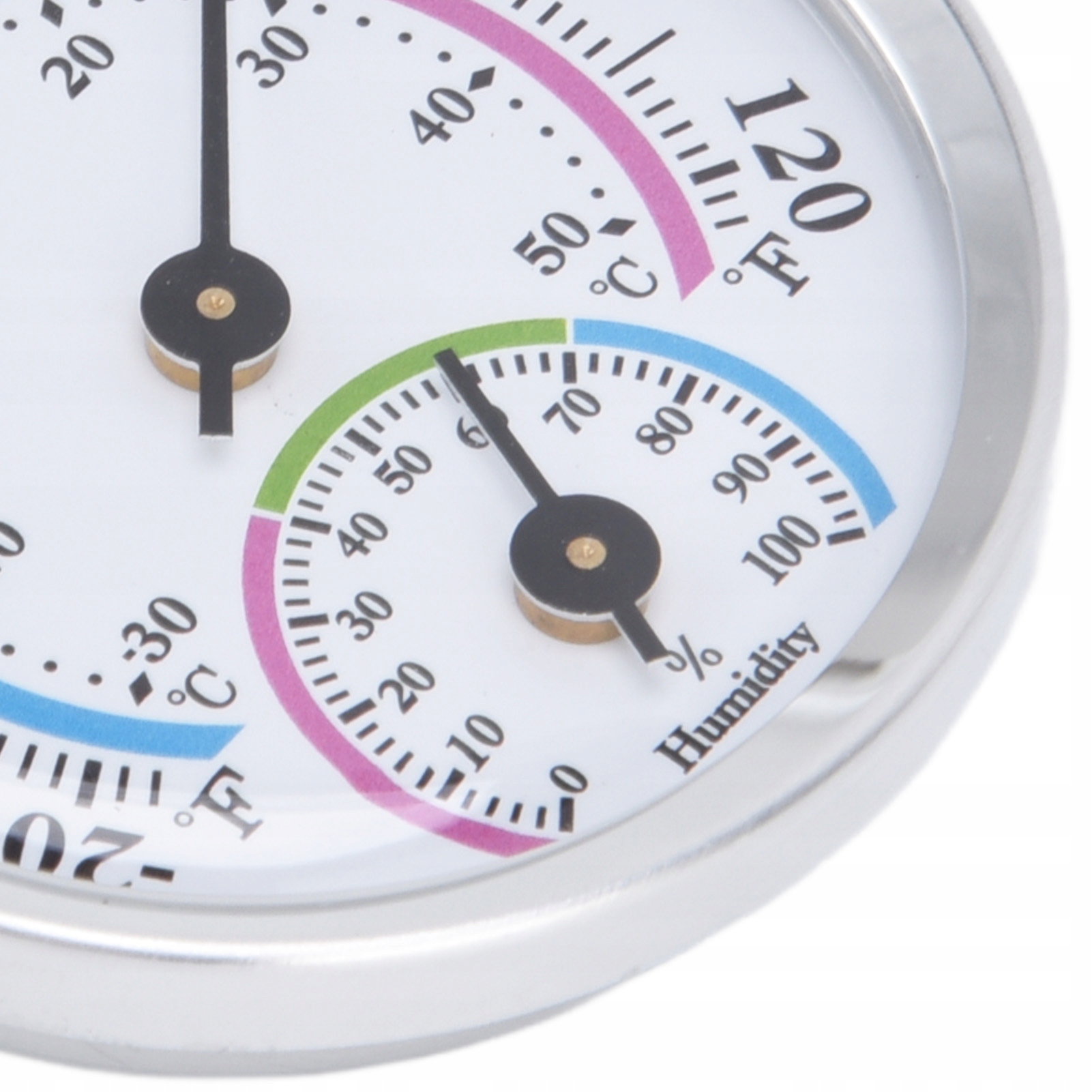 2. Легко читати: сріблястий міні-гігрометр має тонкий прозорий циферблат із чіткою поділкою для легкого читання.
