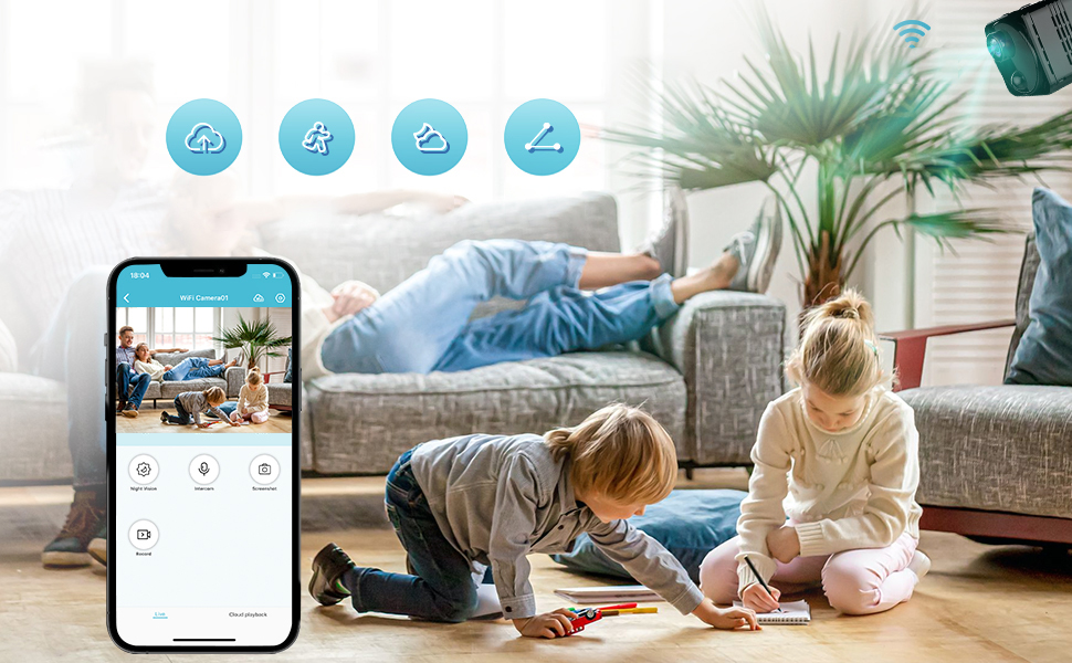 Міні -камера вбудована -в інфрачервоних датчиках "без світіння", яке автоматично вмикається в поганих умовах освітлення, що дозволяє моніторинг зображення з камери 24 години на день. Він також пропонує постійне, безкоштовне зберігання в хмарі в триденному циклі, тому ви можете дивитись фільми за останні 3 дні без картки пам'яті чи підписки.