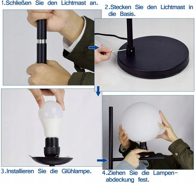 - лампочка в наборі - стояча куля містить лампочку з 9 -В. з теплим білим кольором. Ви також можете згадати відповідну лампочку відповідно до потреб ясності.
