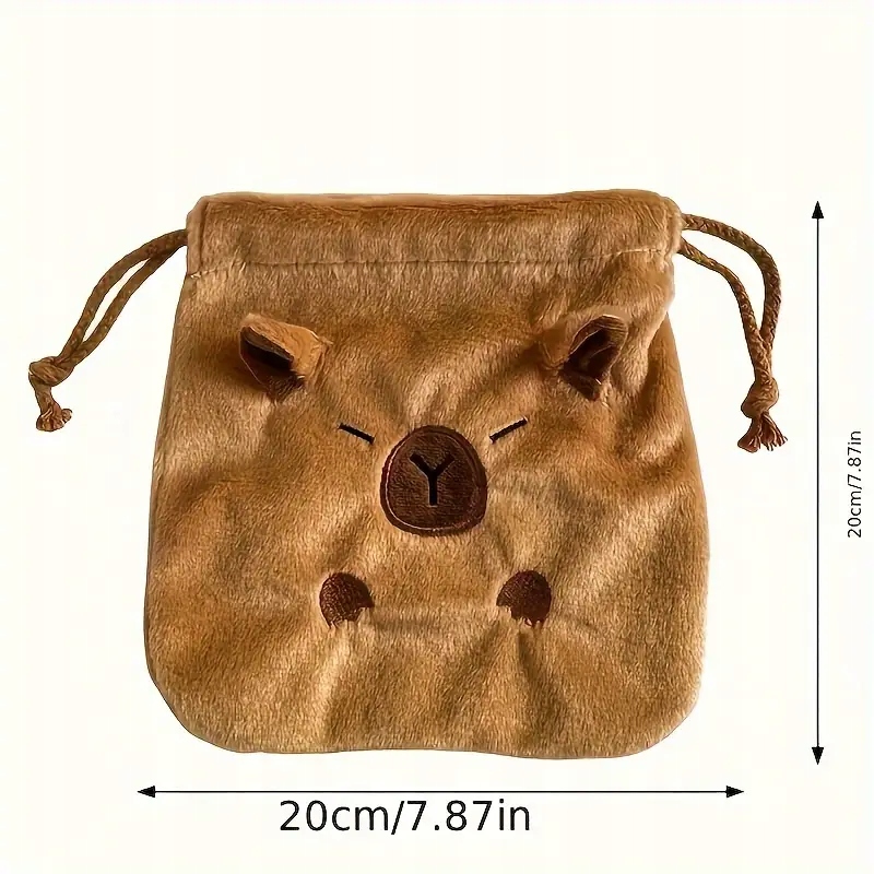 Зроблений з плюшевого матеріалу, він дуже приємний на дотик, має чарівні вуха та рот на душу. Закрито на товстій струні. Коричнева підкладка всередині. Щось чудове для всіх закоханих та закоханих Капібара!