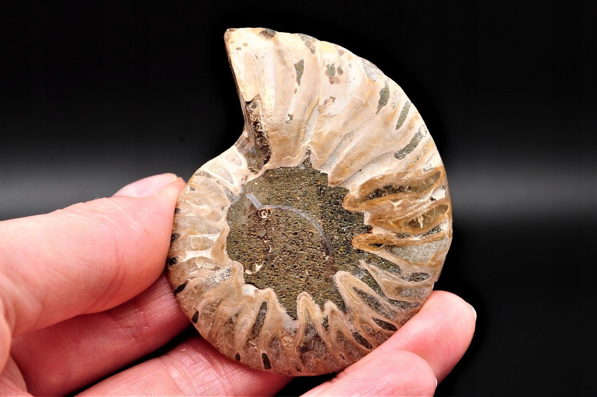 Амоніти (Ammonoidea) - підклас вимерлих головоногих молюсків (Cephalopoda), зазвичай із симетричною плоскоспіральною раковиною. Деякі типи мали незвичайні форми, наприклад, пряма оболонка, вертикально закручена спіраль або спіраль з безконтактними витками. Вони зустрічаються в гірських породах морського походження, що датуються девонським періодом до кінця крейдяного періоду. Деякі окремі камери відкриті та заповнені багатим асортиментом сіро-бежевих і коричневих кристалів кальциту з перегородками між камерами.