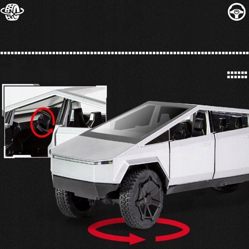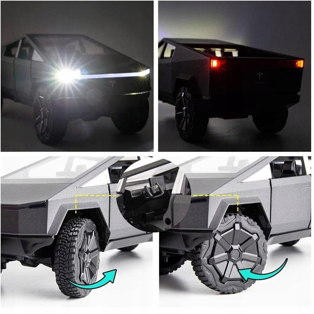 Відлитий під тиском 1:24 для легкових автомобілів і гумових шин Tesla Cybertruck , рекомендована для хлопчиків від 3 років, модель позашляховика має електричні колеса з гумовими шинами, які мають функцію відтягування.