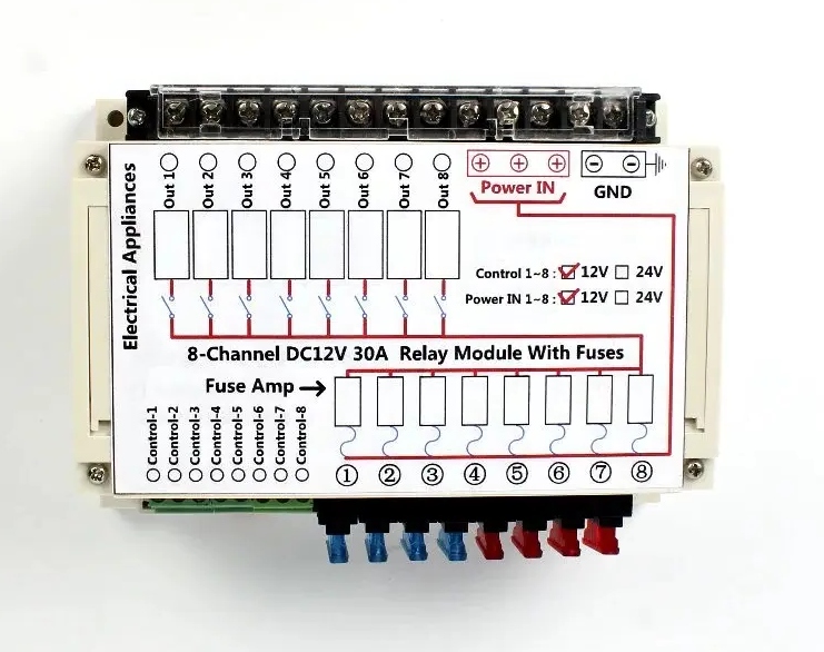 Модуль 8 реле 30А з запобіжниками, електроблок, блок живлення кемпера
