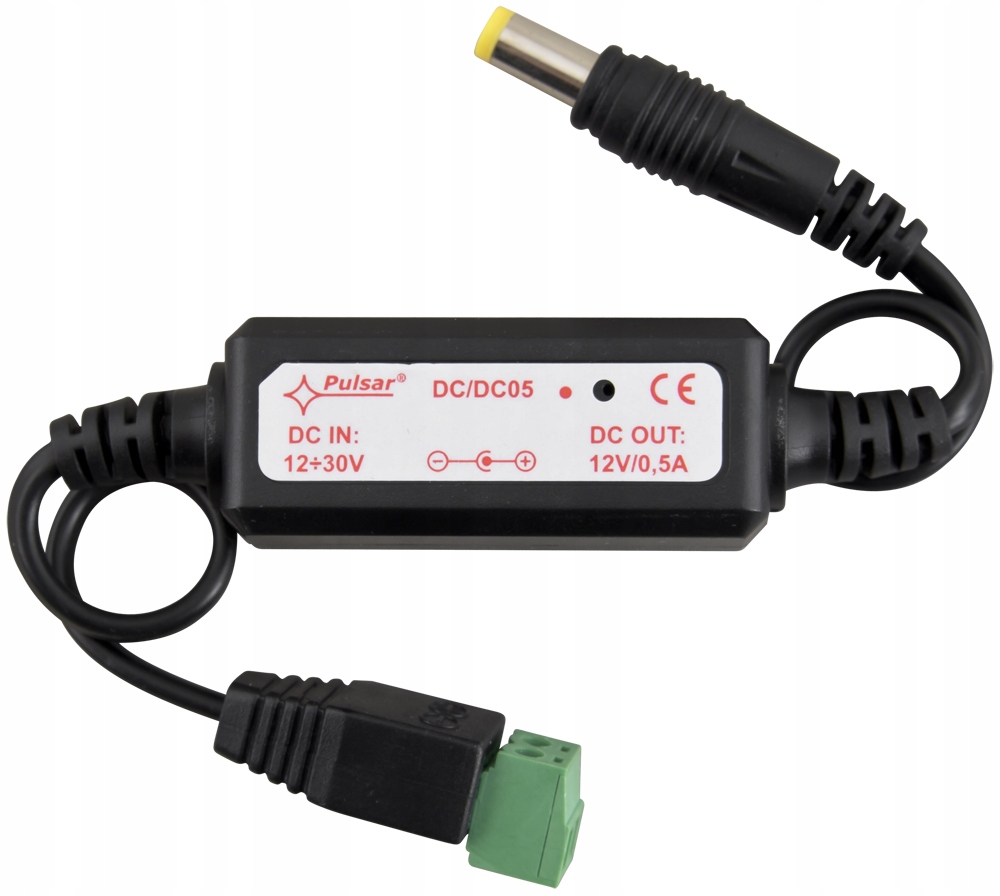 DC/DC05 - Вставний перетворювач, який зменшує вхідну напругу з діапазону 12–30 В постійного струму до 12 В постійного струму (макс. 0,5 A). Універсальний і надійний, його можна використовувати для живлення пристроїв 12 В постійного струму, які потрібна стабілізована напруга. Перетворювач широко використовується в системах спостереження CCTV для живлення камер від джерел живлення з більшою вихідною напругою.