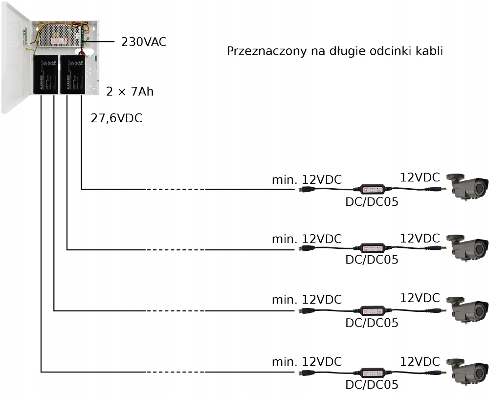 Великою перевагою моделі DC/DC05 є завершення вихідного кабелю стандартним штекером JACK 5.5 / 2.1. Завдяки цьому конвертер може ефективно працювати практично з будь-якою камерою системи відеоспостереження.