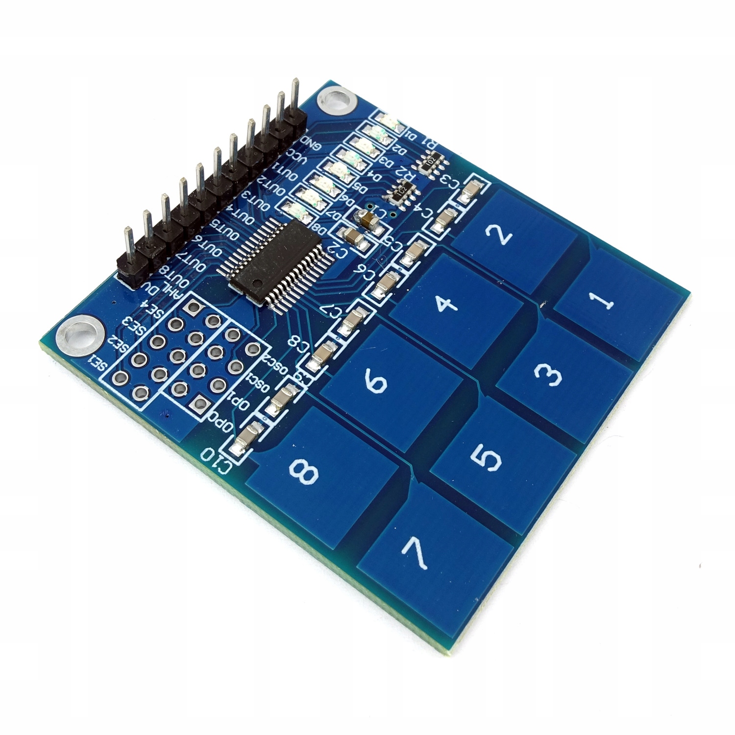 TTP224 Тактильний модуль клавіатури з вісьмома кнопками. Він має 8 світлодіодів, що сигналізують кнопки та 8 цифрових виходів, присвячених кожній кнопці. Модуль може живитися від напруги від 2,4 В до 5,5 В, щоб без перетворювача напруги міг працювати з усіма популярними мікроконтролерами.