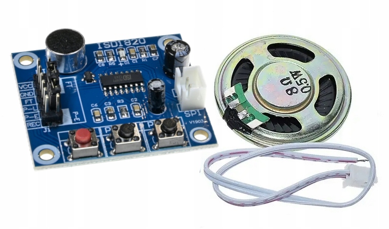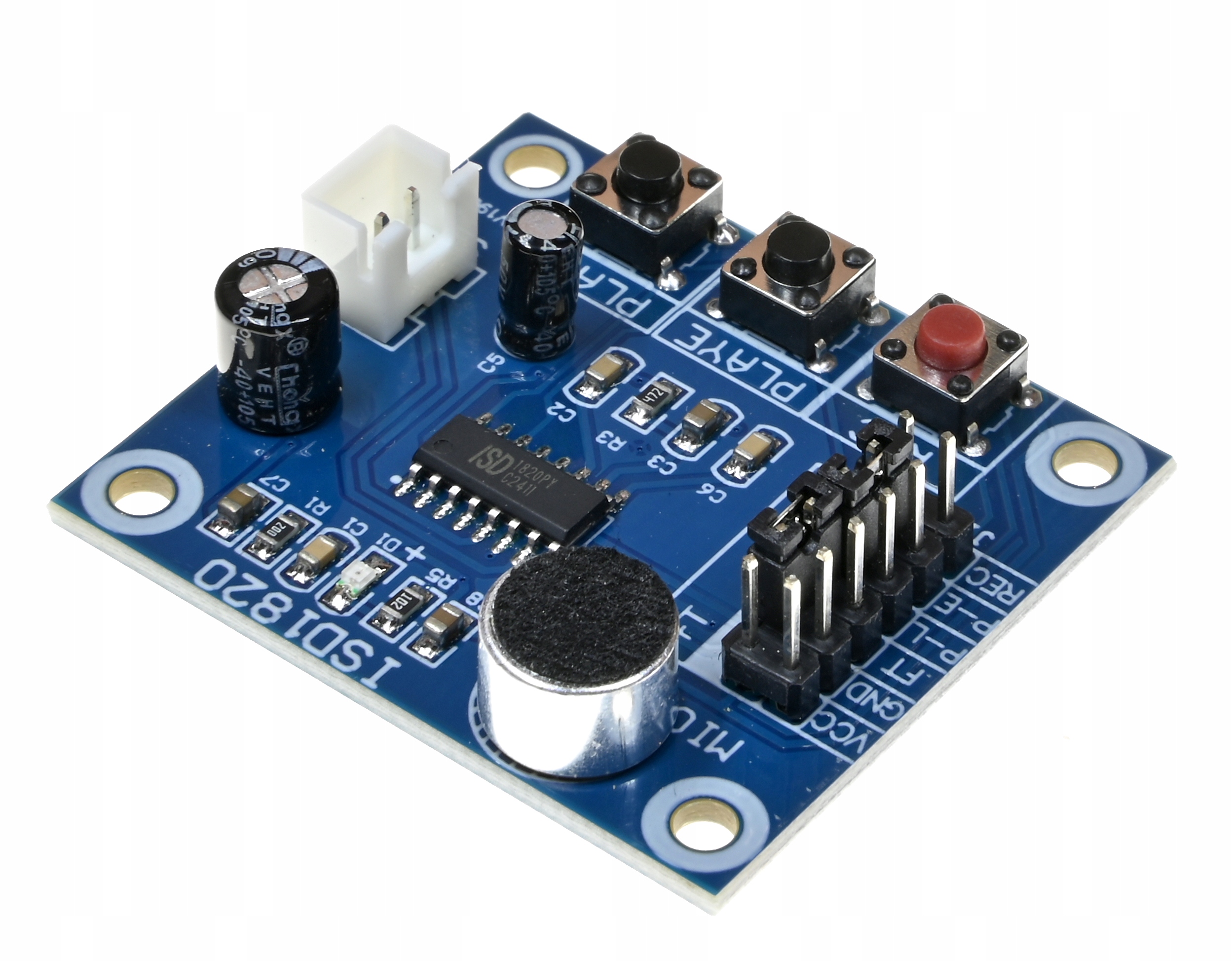 Модуль ISD1820 - це компактне рішення для запису та відтворення звуку. Це дозволяє зберігати та відтворювати короткі голосові повідомлення, що робить його ідеальним для систем сповіщень, домашньої автоматизації та інтерактивних іграшок. Це основний модуль ідеальний для навчання та хобі -проектів . Що стосується більш вимогливих додатків, використання зовнішнього підсилювача або динаміка з кращою якістю звуку.