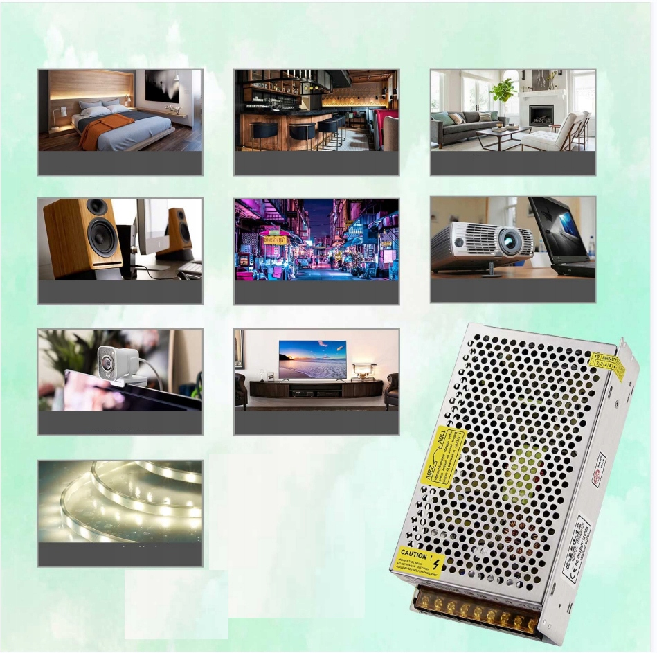 Імпульсний блок живлення з трансформатором живлення 12 В 20 А підходить для світлодіодних стрічок. Також підходить для охоронного спостереження, маршрутизаторів, дисплеїв і аудіопристроїв з однаковим струмом і напругою.