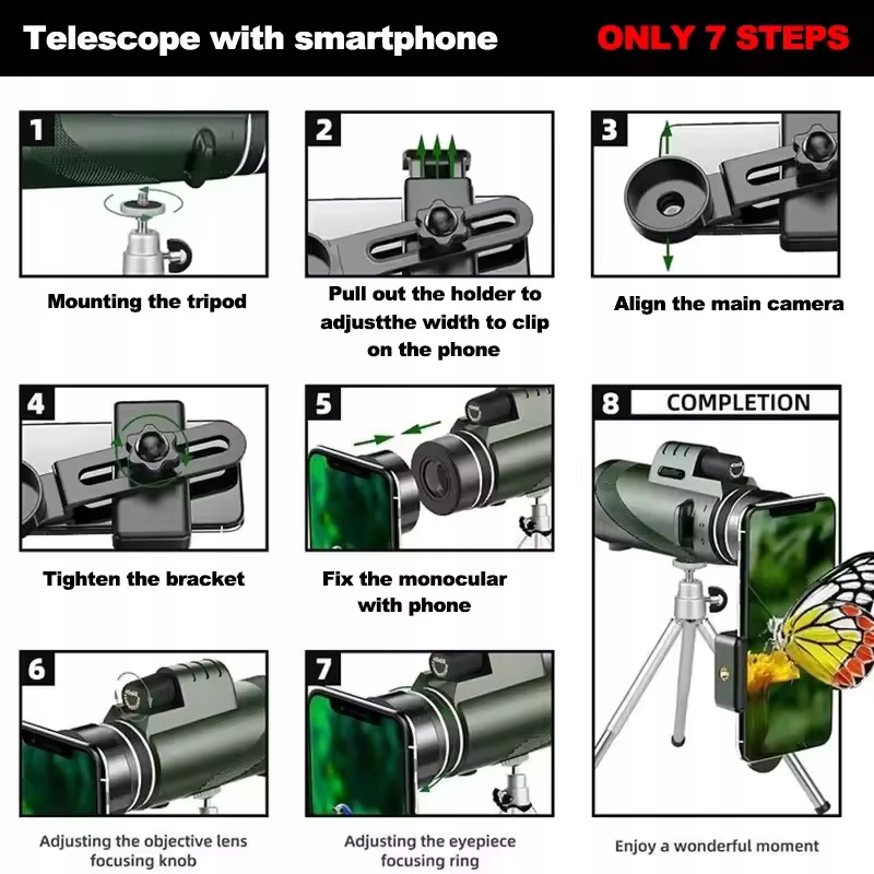 Монокулярний ідеально підходить для походів, полювання, сходження, підйому птахів, диких тварин, спостереження за видами, гольфом, спостереженням, всілякими видами та спостереженнями за подорожі. Він має велике збільшення, щоб забезпечити найкращий вигляд під час пригод на свіжому повітрі