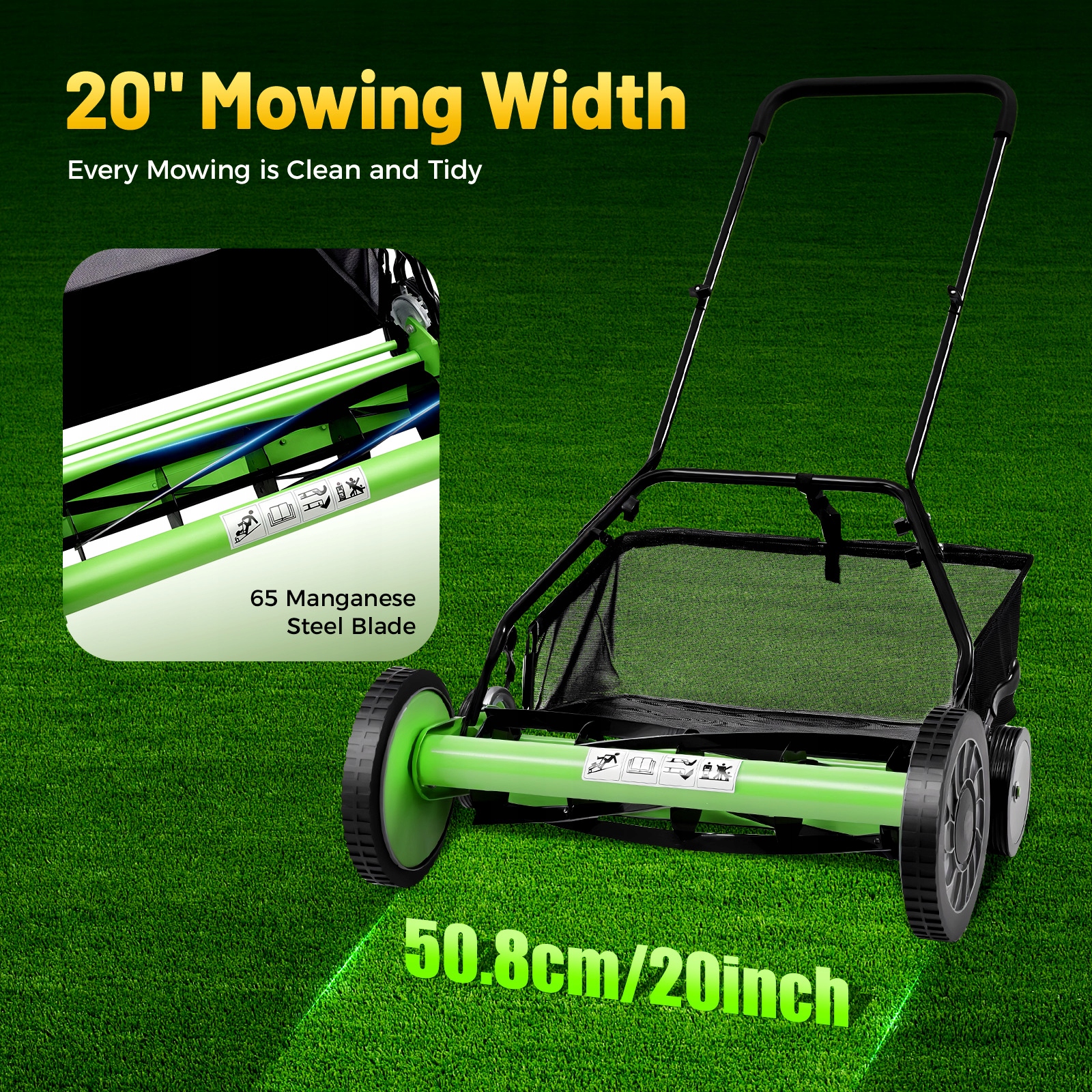 - Велика площа скошування: набір гострих дисків, ширина різання 20 дюймів і нековзкі колеса з великою шириною зручності коситимуть приблизно 5381 ft2 газону.