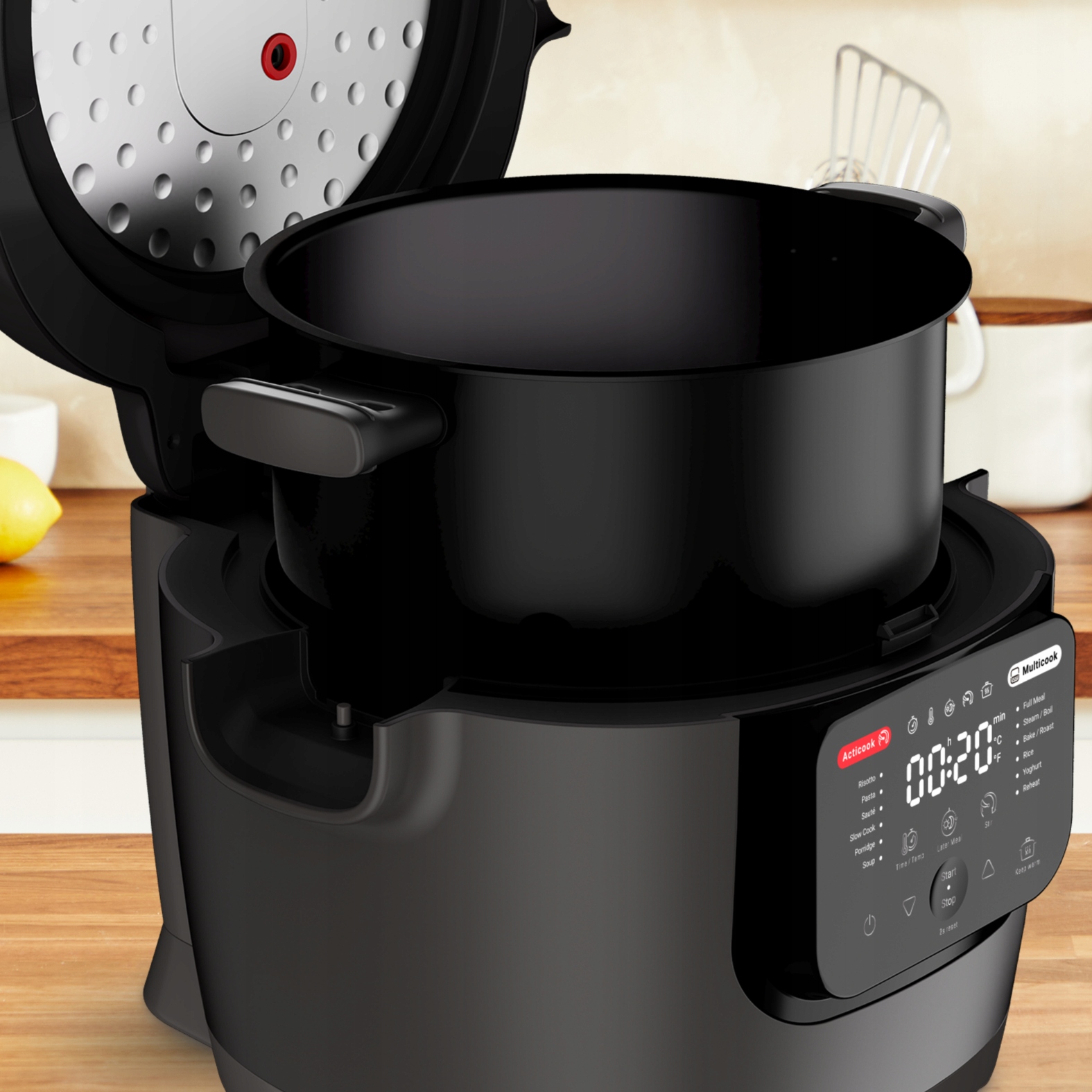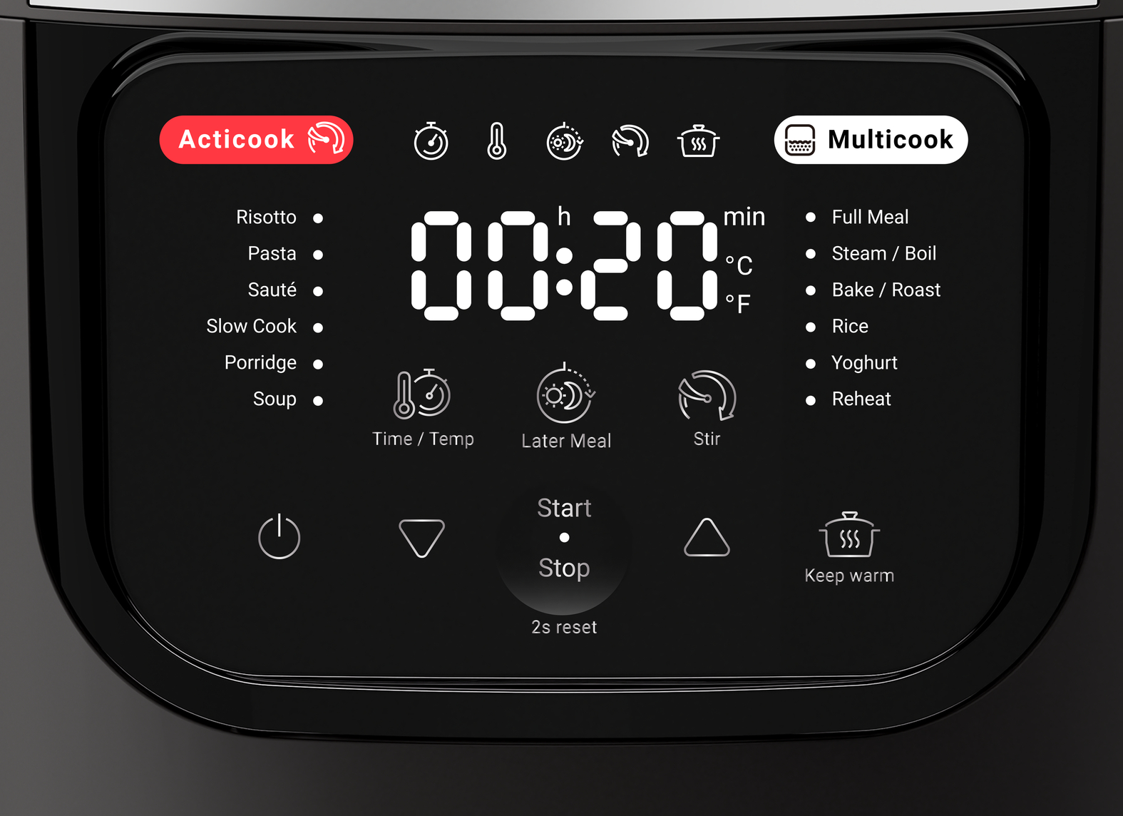 Дисплей мультиварки простий у використанні та інтуїтивно зрозумілий. Іноді достатньо одного натискання, щоб розпочати процес приготування їжі. Чіткі значки дозволять вам легко ввімкнути таймер, відкласти старт, підтримувати тепло чи регулювати температуру.