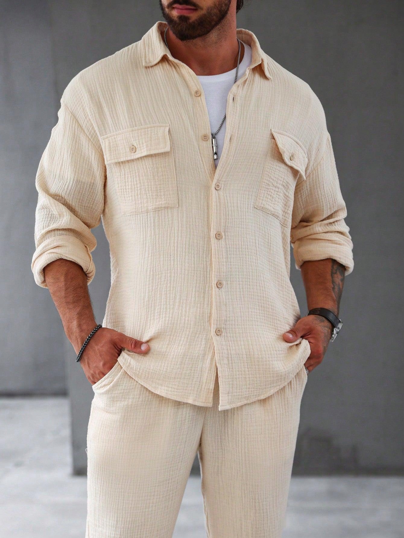 МУСЛІНОВИЙ КОМПЛЕКТ СВІТЛО-БЕЖЕВА СОРОЧКА З КИШЕНЯМИ ДОВГІ SHEIN ШТАНИ M