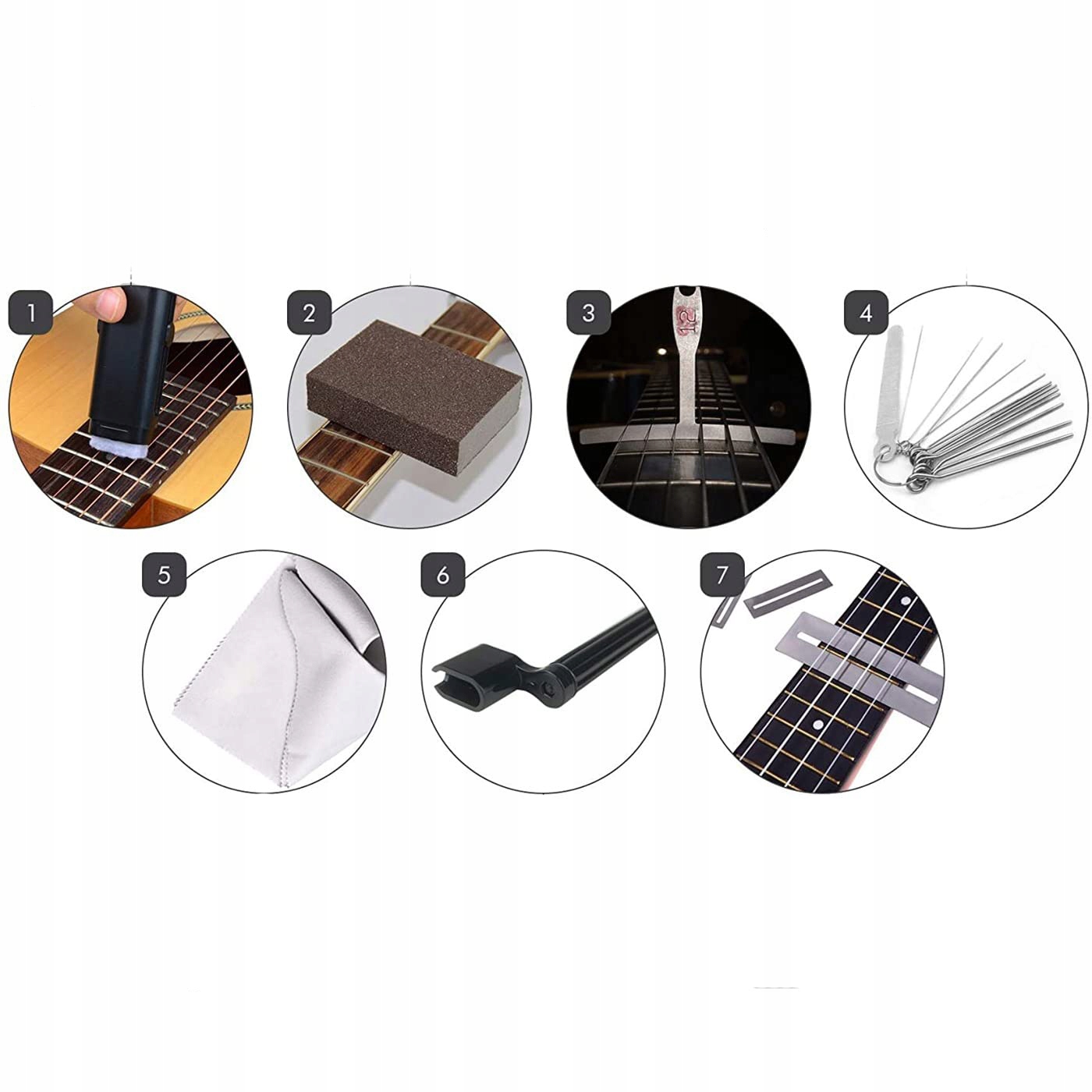 Все, що потрібно, щоб професійно доглядати за своїм інструментом: камінням та шліфувальними губками, файлами, струнним різанням, звинуваченнями, рядками, що затягують кілочки, лінійки Фріца, кривошипа, файлів голки, захисників для шліфування порогів, віолончель -cubes, строгів, перемикання інструментів для очищення та встановлення рядків.