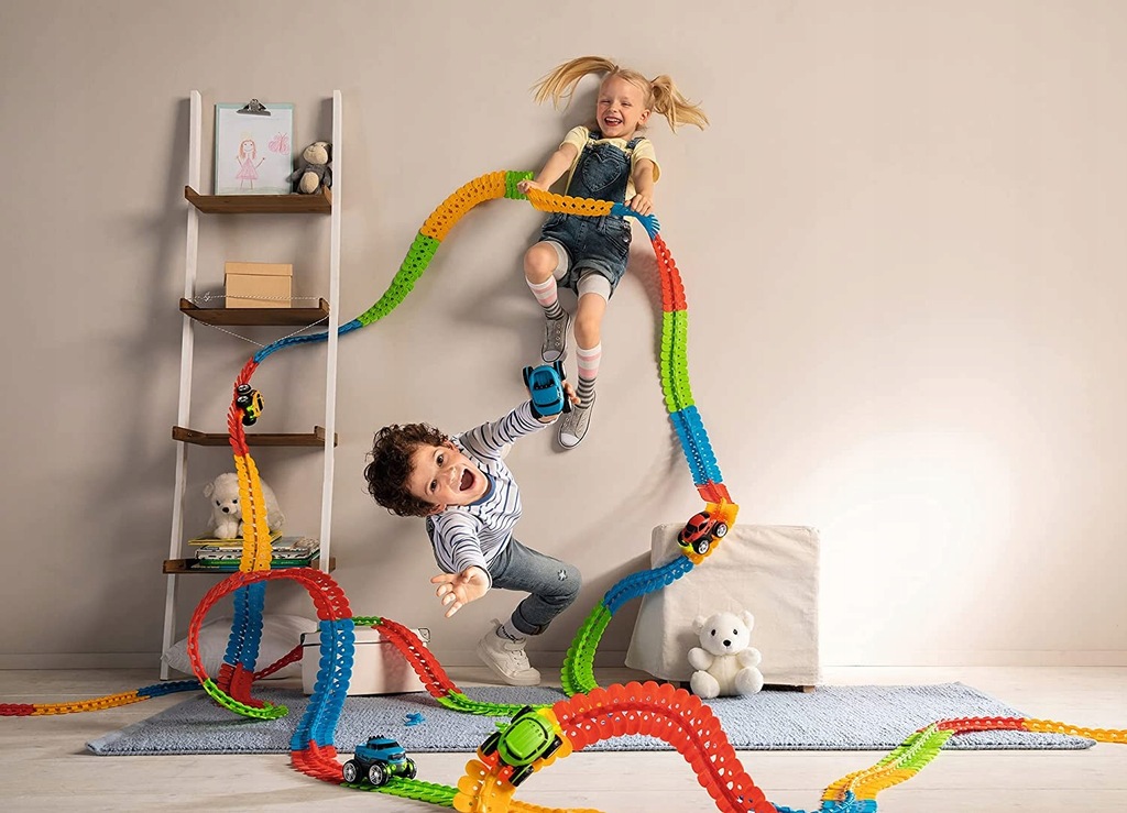Набір містить 184 кольорові елементи, з яких можна побудувати гоночну трасу довжиною до 4,40 м. Ми можемо будь-коли перебудувати нашу трасу, винаходячи нові завдання. Ви будете створювати захоплюючі спіралі, екстремальні нахили та круті повороти, а потім перевірятимете, як включений автомобіль впорається із завданням. Спеціальний механізм з’єднання робить всю конструкцію стабільною та гнучкою.