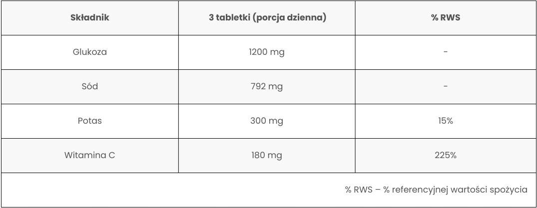 Дієтична добавка Elektrolyte зі смаком тропічних фруктів містить натрію, калій, глюкозу та вітамін С. Продукт у формі блискучих таблеток для розчинення у воді. Він призначений для дорослих та дітей старше 3 років, як доповнення до щоденної дієти. Рекомендується використовувати дієтичну добавку під час посиленого відчуття бажання або впливу збільшення втрати рідини, спричиненої зокрема інтенсивними фізичними навантаженнями та в спекотну погоду.