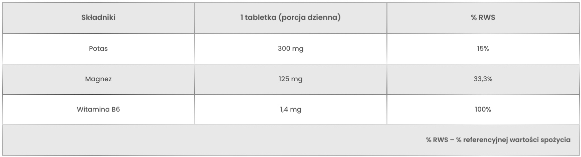 Дієтична добавка для дорослих як доповнення до дієти в магнію та калію та вітаміну В6. Магній та калій допомагають у належному функціонуванні м’язів, крім того, разом з вітаміном В6, вони підтримують роботу нервової системи. Калій допомагає підтримувати нормальний артеріальний тиск.