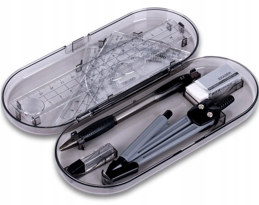 Пакет включає: 1 олівець, 1 олівець зі змінною начинкою, 2 трикутні лінійки, 1 пряма лінійка, 1 транспортир, 1 графічний циркуль і 1 біла гумка.