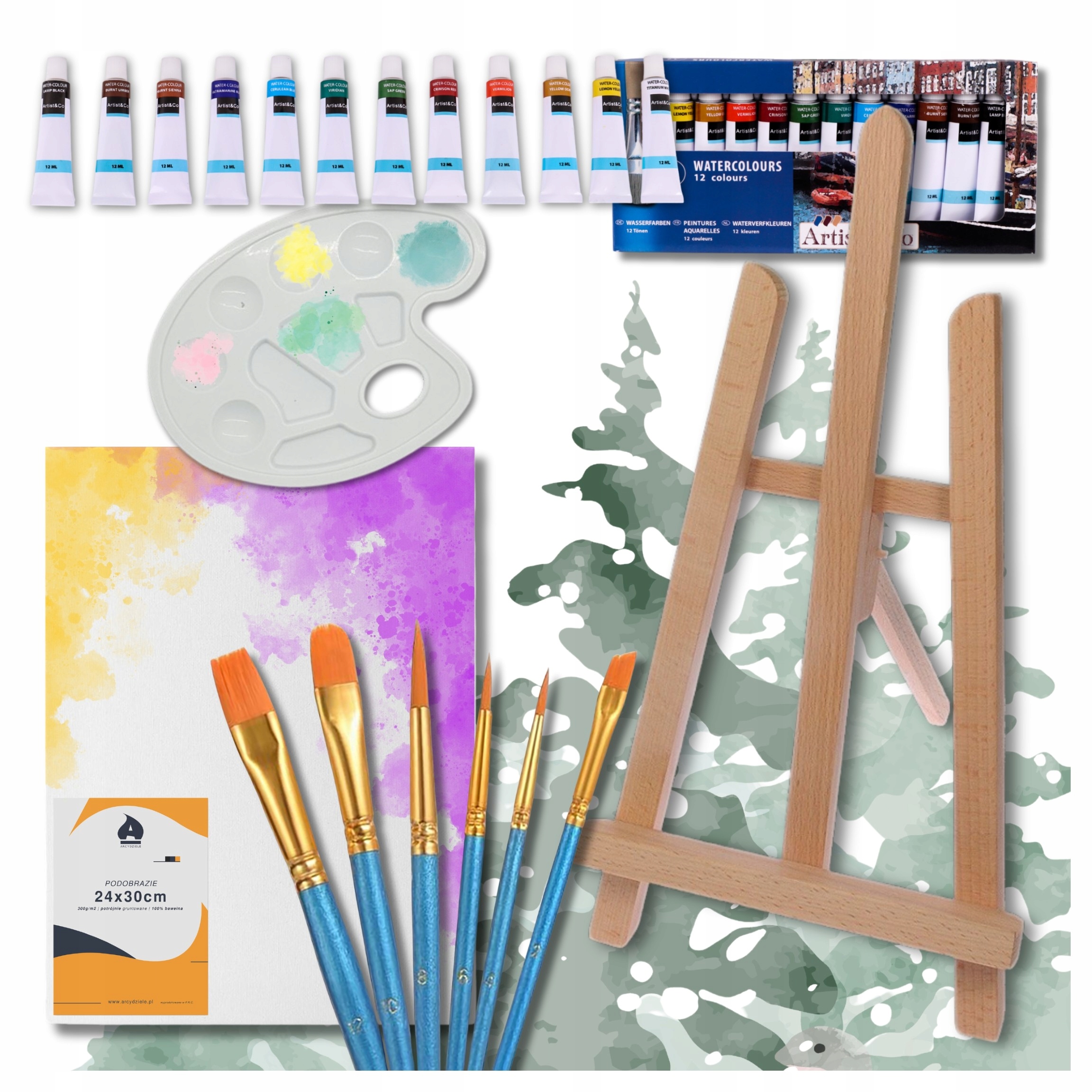 ❤ Набір для малювання Masterpiece містить набір аксесуарів, необхідних для початку вашої мистецької подорожі. Він пропонує солідний мольберт, відповідне полотно, колекцію акварельних фарб і набір різних пензлів.