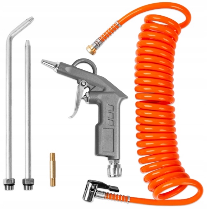 Шланг спіральний 5м довгий, гофрований з двох сторін, з конектором і швидкісним конектором 1/4 дюйма. Корисно для підключення елементів комплекту до компресора або для подовження пневматичних шлангів.