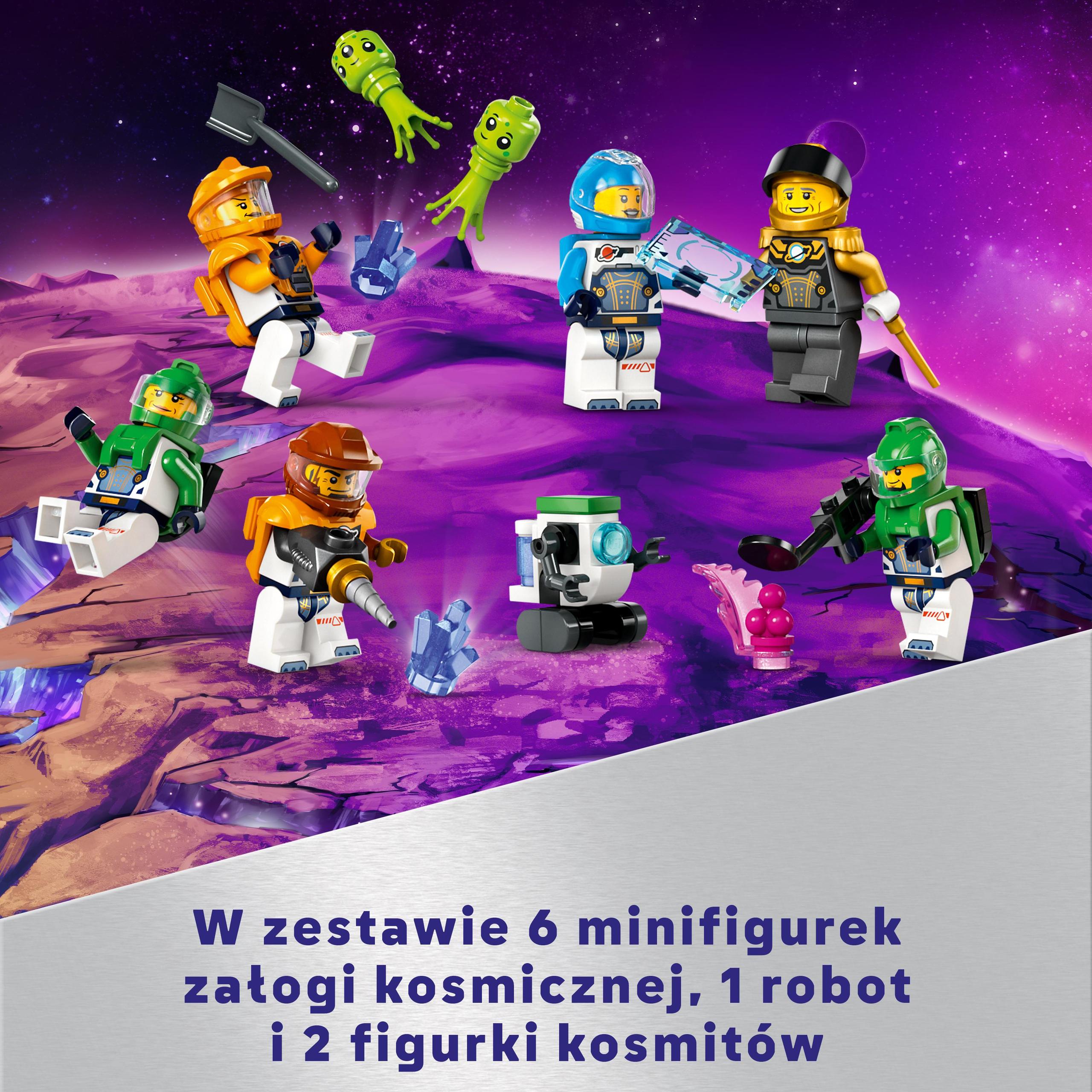 Що входить до цього ігрового набору LEGO City? Усі елементи для побудови космічної бази з баштовим краном, що обертається, космічним кораблем, стартовим майданчиком, вантажівкою, планетою, шістьма мініфігурками та фігурками робота та двох прибульців.