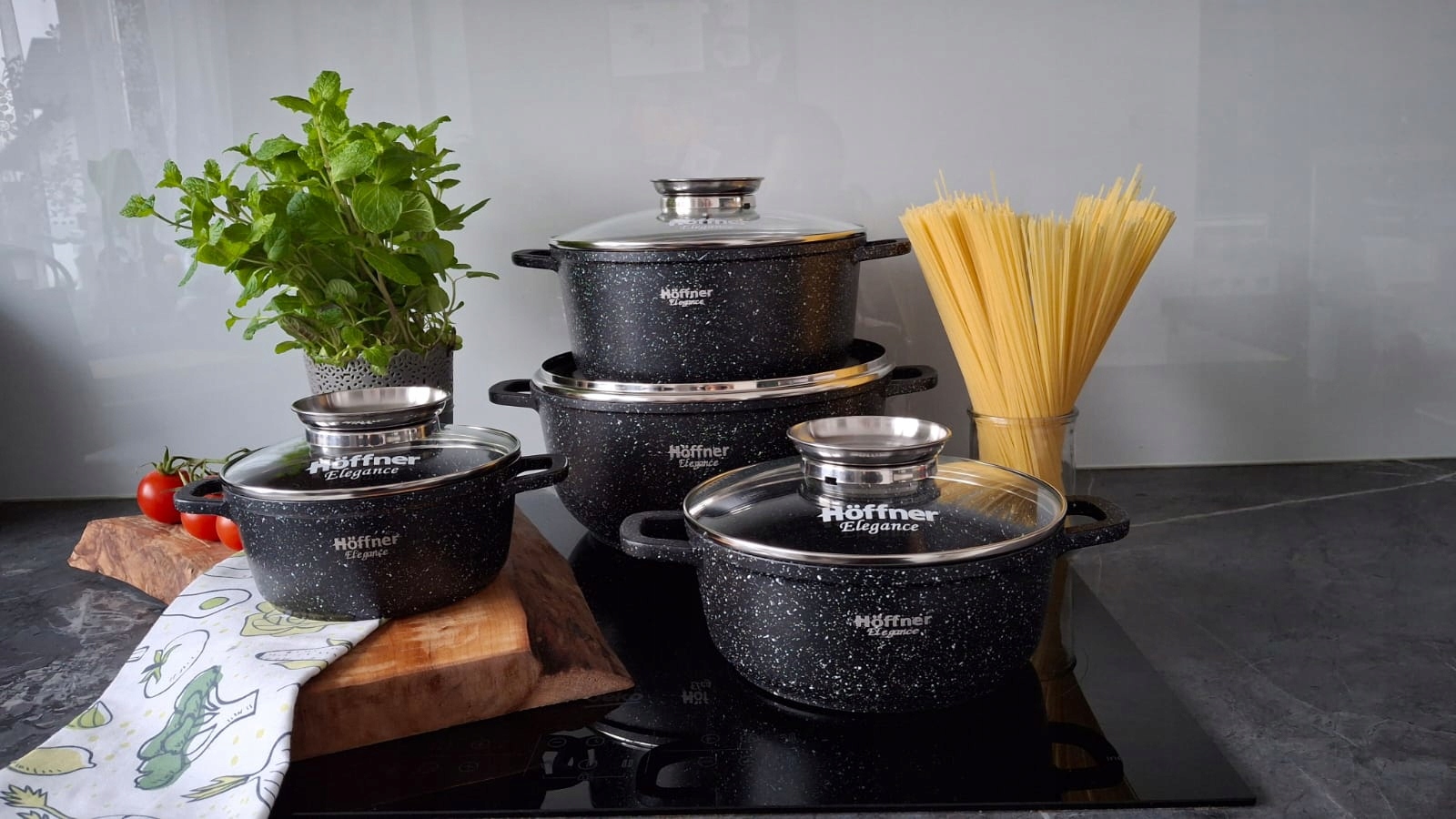 Відкрийте для себе зручність та задоволення від приготування з нашим набором мармурових горщиків Hoffner 7835, створеним для повного задоволення потреб вашої кухні. Цей 17-елементний набір поєднує функціональність з елегантним, сучасним дизайном , що забезпечує все необхідне для створення кулінарних шедеврів на печах усіх типів: індукція, газ, електрична та кераміка.