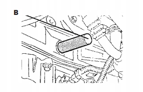 B – Фіксуючий штифт колінчастого вала (B), який розташовує колінчастий вал у ВМТ, вставляється через блок двигуна та знаходиться в пазу, розташованому на першому ланцюзі колінчастого вала.
