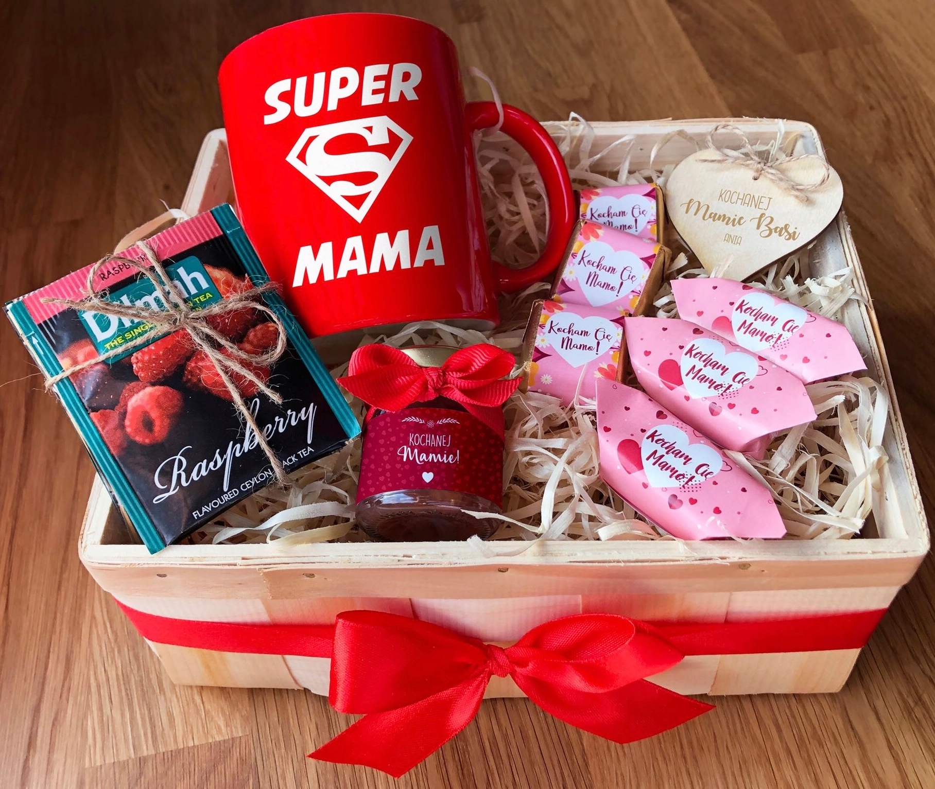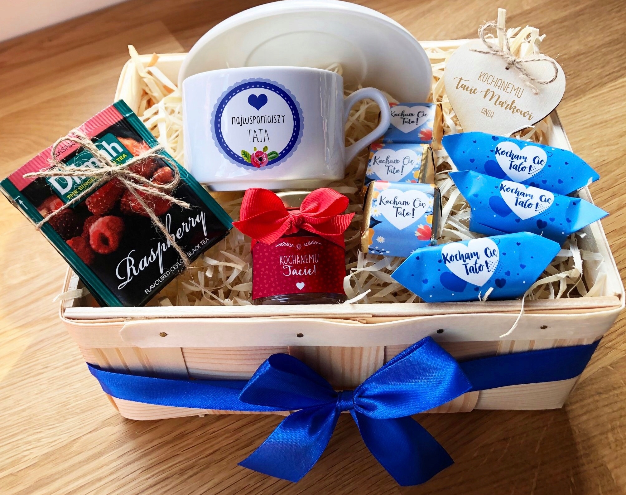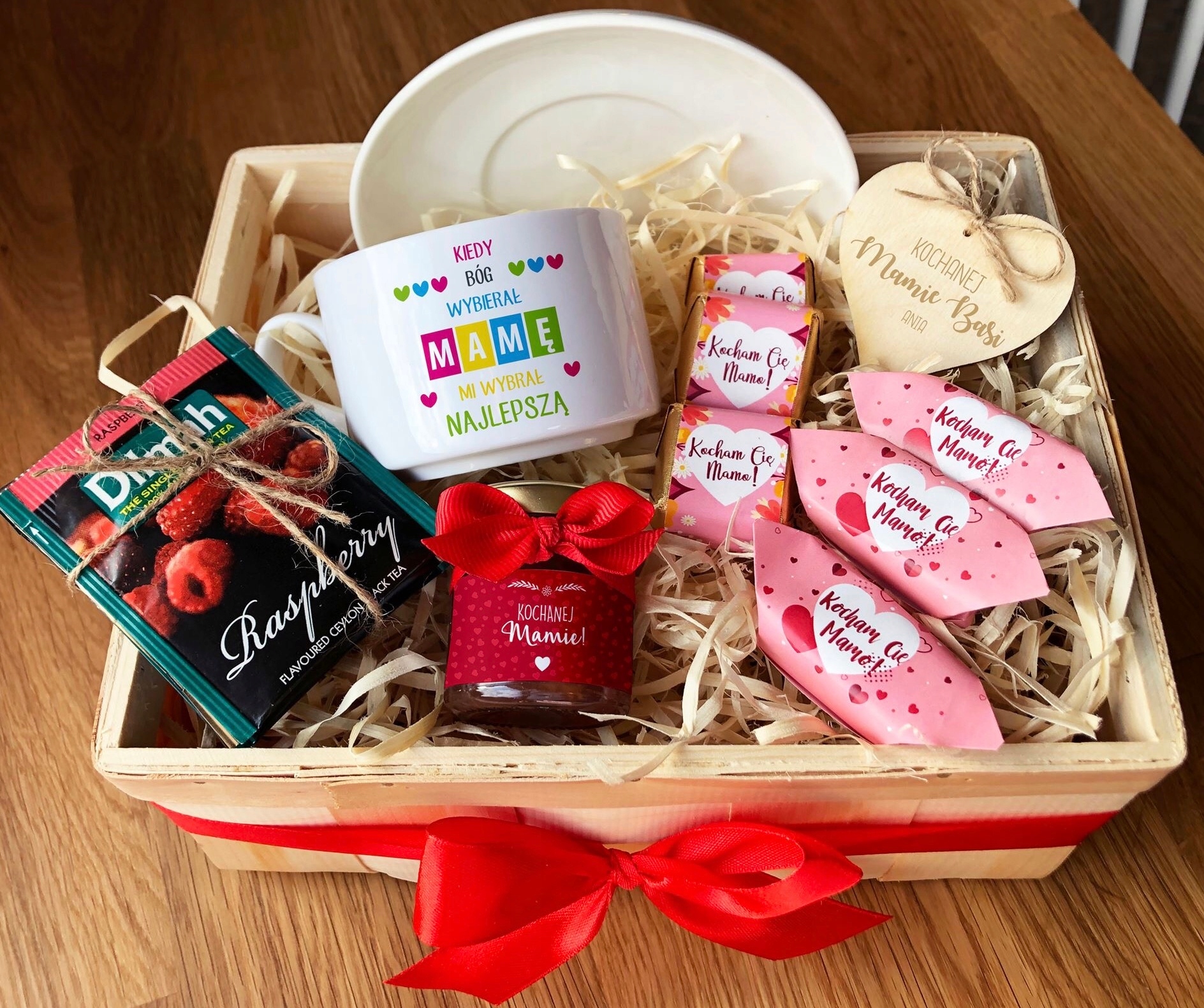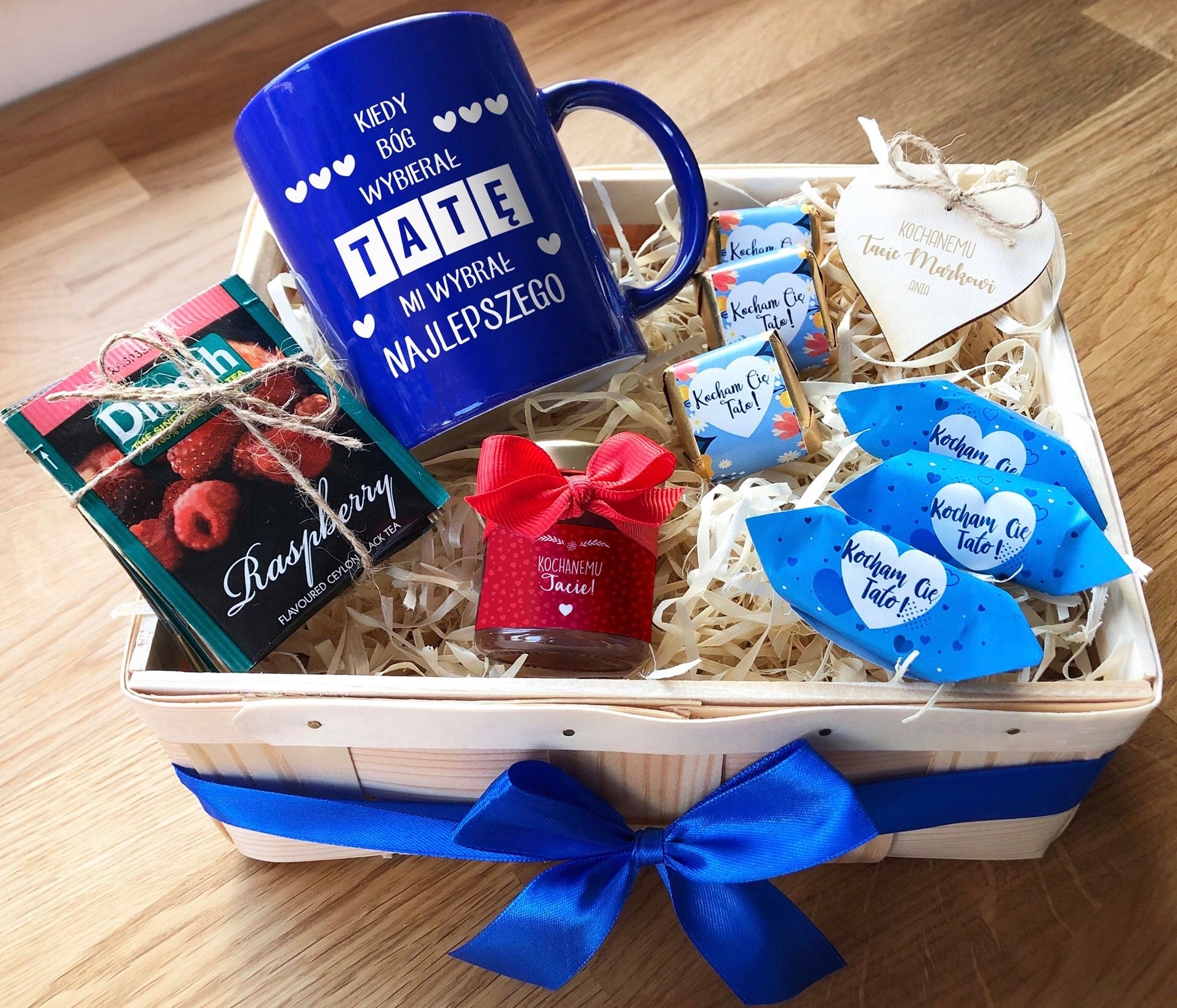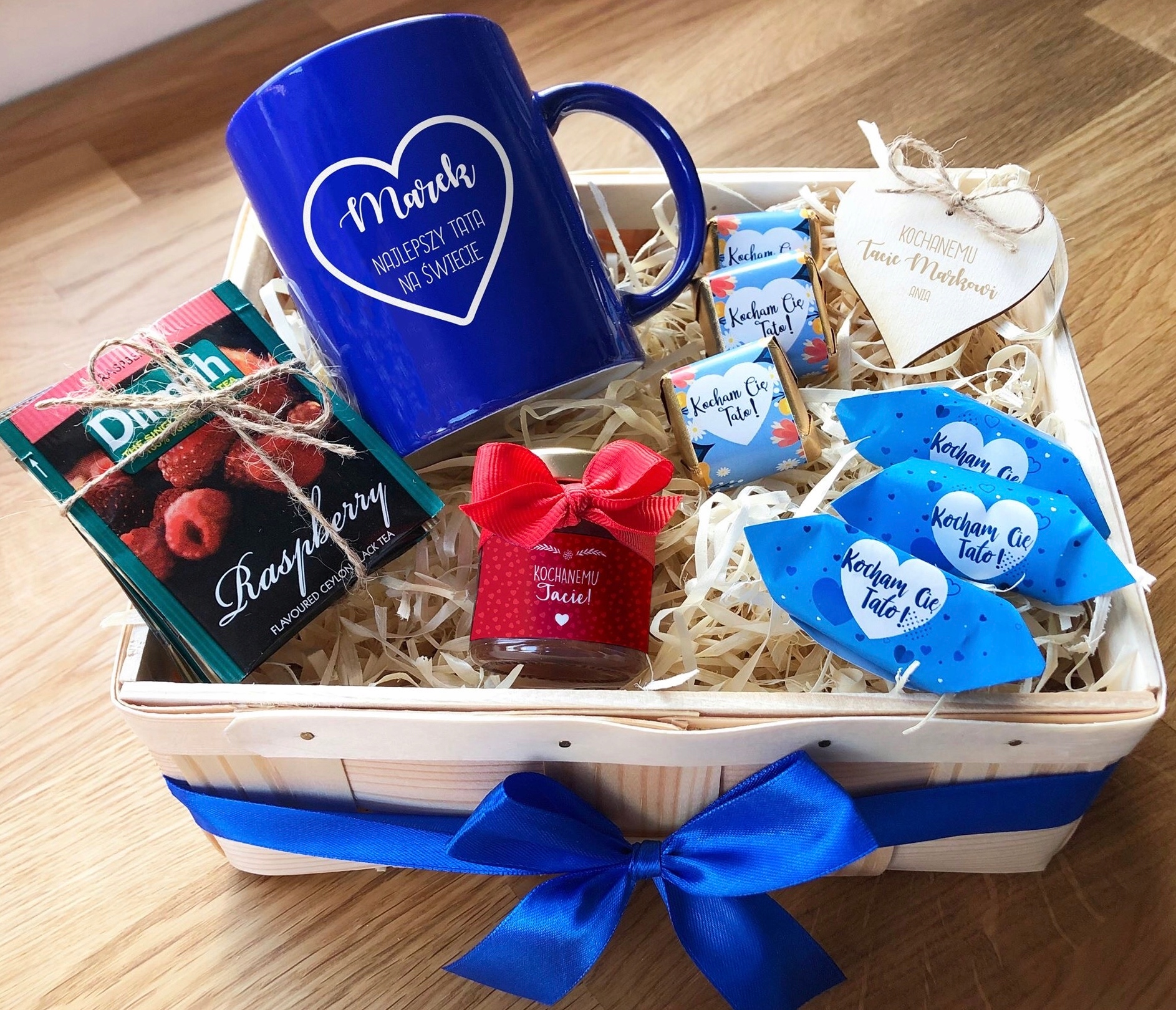 Гарний набір для мами чи тата в кошику У набір входять: чашка з принтом (150 мл) або кухоль (300 мл) з гравіюванням, 5 чаїв (мікс смаків), 3 великі помадки, 3 шоколадні цукерки з фісташковою начинкою, мед 40 мл, дерев'яне серце з вашим гравіюванням.