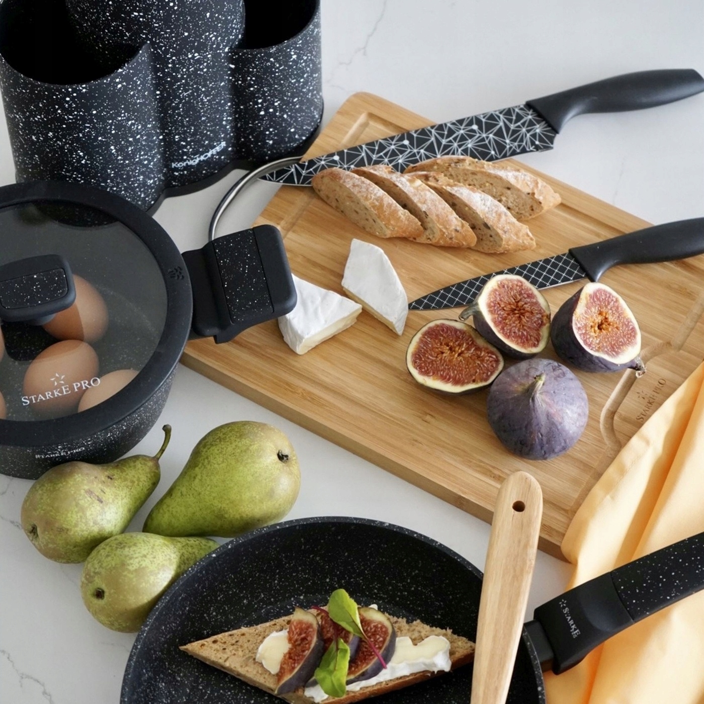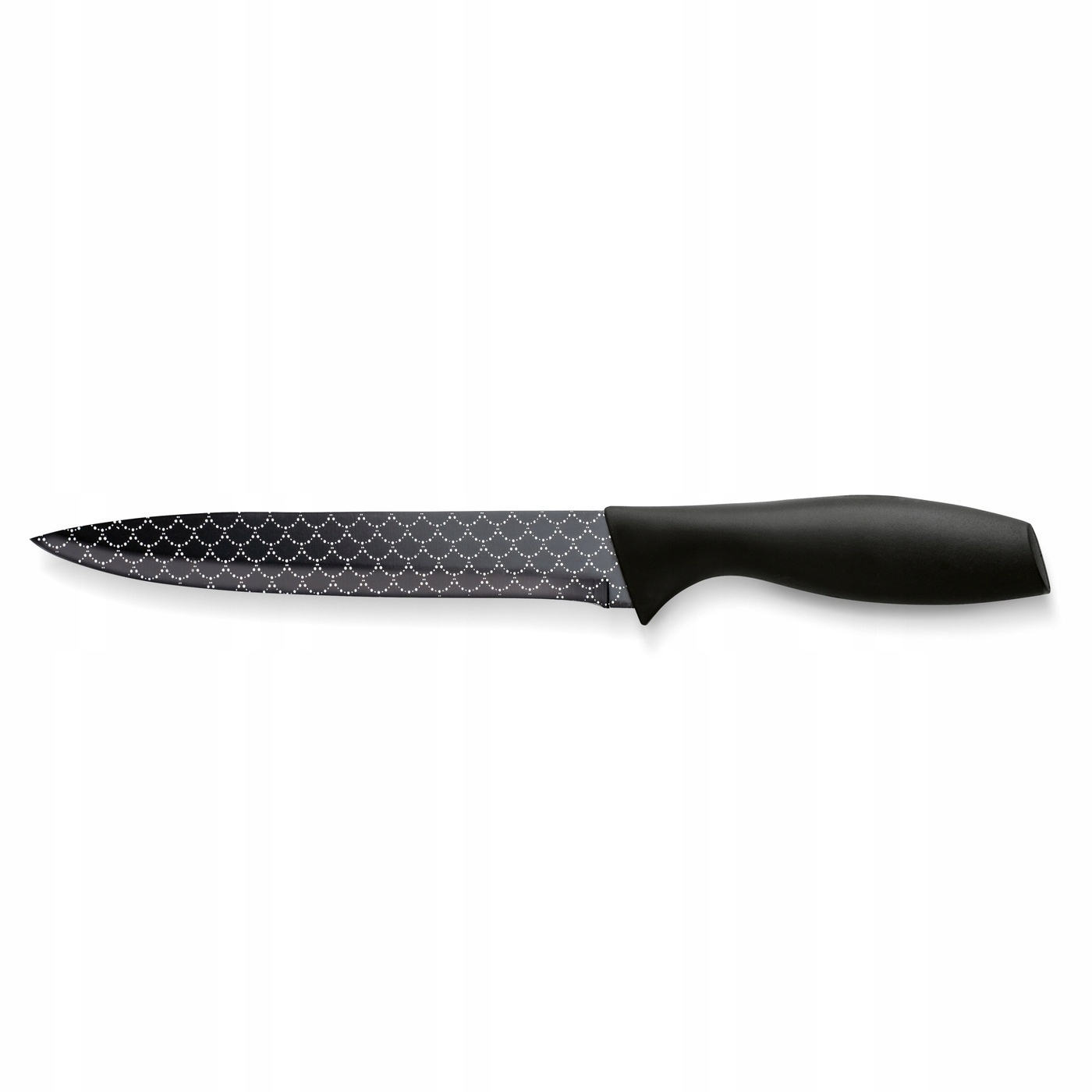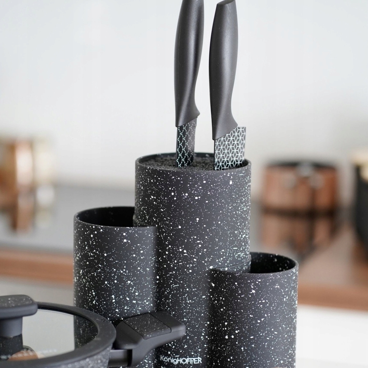Набір з 4 кухонних ножів Konighoffer Blake підходить для щоденного використання в кожному домі. З універсальними ножами можна швидко впоратися, наприклад, з приготуванням бутербродів і помідорів, які потрібно нарізати тонкими скибочками. Ви також можете використовувати їх для подрібнення інгредієнтів салату без проблем. Ніжні і м'які інгредієнти не будуть подрібнюватися. Кухарським ножем можна обробляти печеню, м’ясо, випічку та рибу. Використовується також для подрібнення. За допомогою ножа Santoku ви можете нарізати все, що завгодно. Леза з високоякісної нержавіючої сталі міцні та надійні. Вони довго залишатимуться гострими та забезпечать точність у роботі. Вони покриті антипригарним покриттям, яке запобігає прилипання їжі. Ручки мають профільовану форму і оброблені поверхнею soft touch. Це означає, що вони не ковзають навіть у мокрих руках. Поєднання матового чорного і геометричного візерунка додає комплекту елегантності та сучасного стилю. Дві овочечистки виготовлені із пластику та мають сталеві леза. Це надає їм велику міцність і полегшує догляд. Підходять для чищення овочів і фруктів різної форми. Вони впораються навіть з найтвердішою шкіркою кабачків. Їх горизонтальне і вертикальне лезо дозволить отримати тонку стружку і зменшити харчові відходи. Скребки також забезпечать вам безпеку під час очищення - ви можете легко уникнути випадкових порізів рук. З ними на кухні вам не доведеться турбуватися про безлад після стругання. З цим набором очищувачів ви впораєтеся з усім дуже швидко.