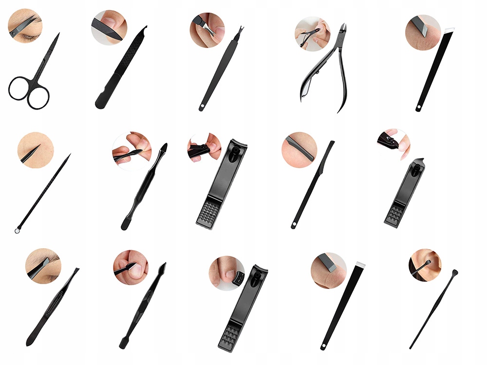 набір для догляду за нігтями в елегантному випадку є обов'язковим для кожної жінки. Елементи набору були виготовлені з вольфрамової сталі . Вони характеризуються високою силою , це стійкий до стирання та волів . Матеріал гіпоаллергенна, не викликає алергії .
