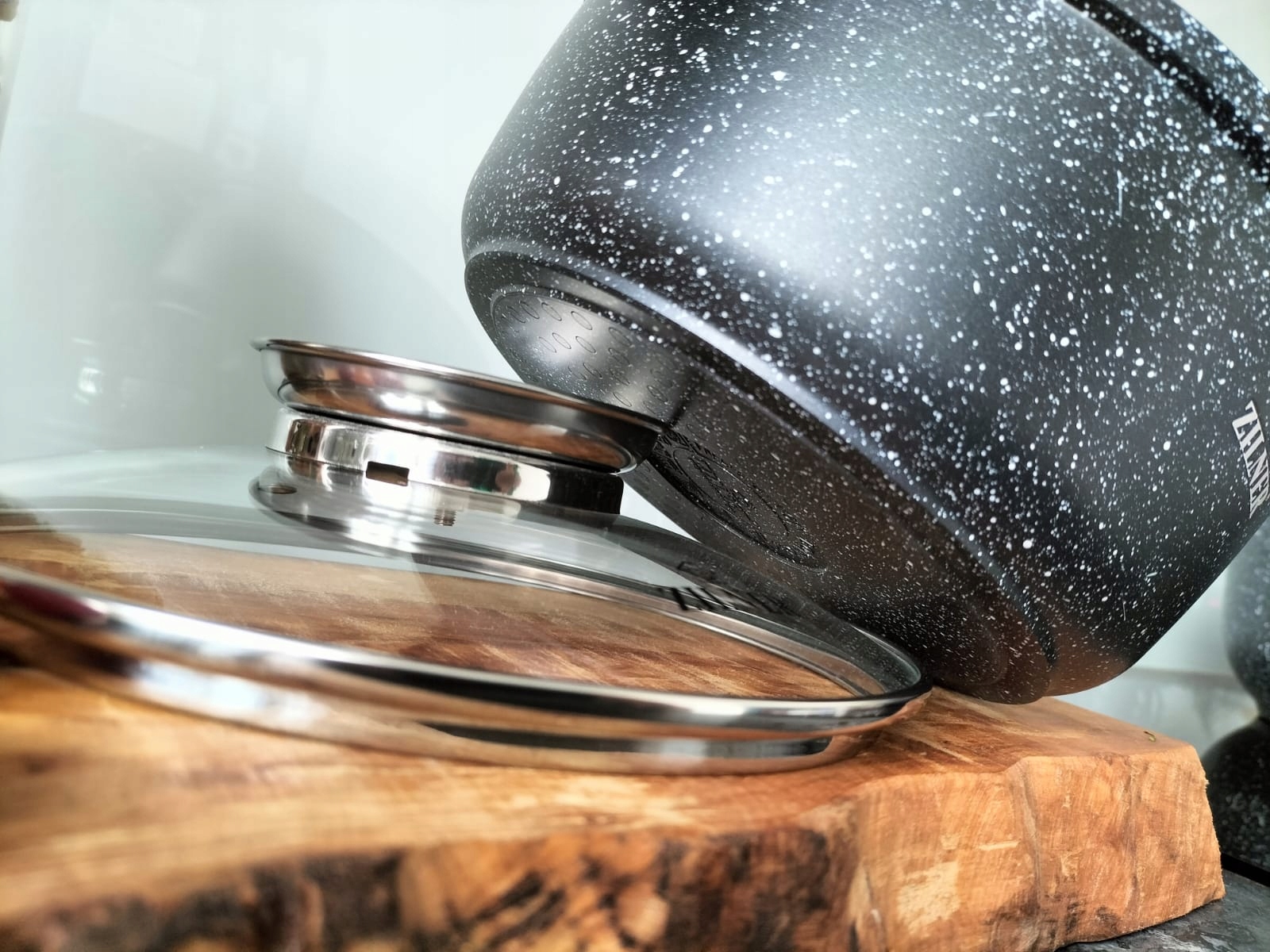 ✔️ Унікальне мармурове покриття: горщики покриті сучасним мармуровим покриттям, яке не лише надає їм стильний вигляд, а також забезпечує довговічність і стійкість до подряпин. Завдяки цьому покриттю ви можете готувати з мінімальною кількістю жиру, що підтримує здоровий спосіб життя.