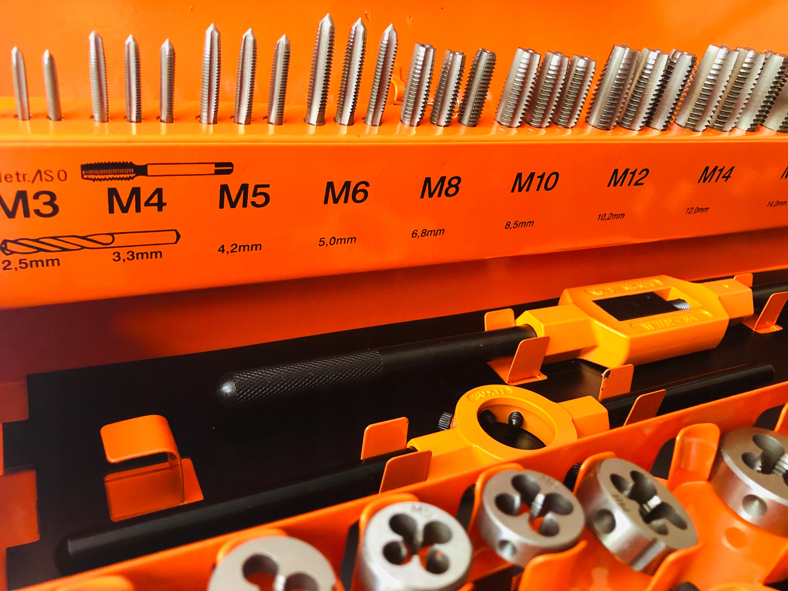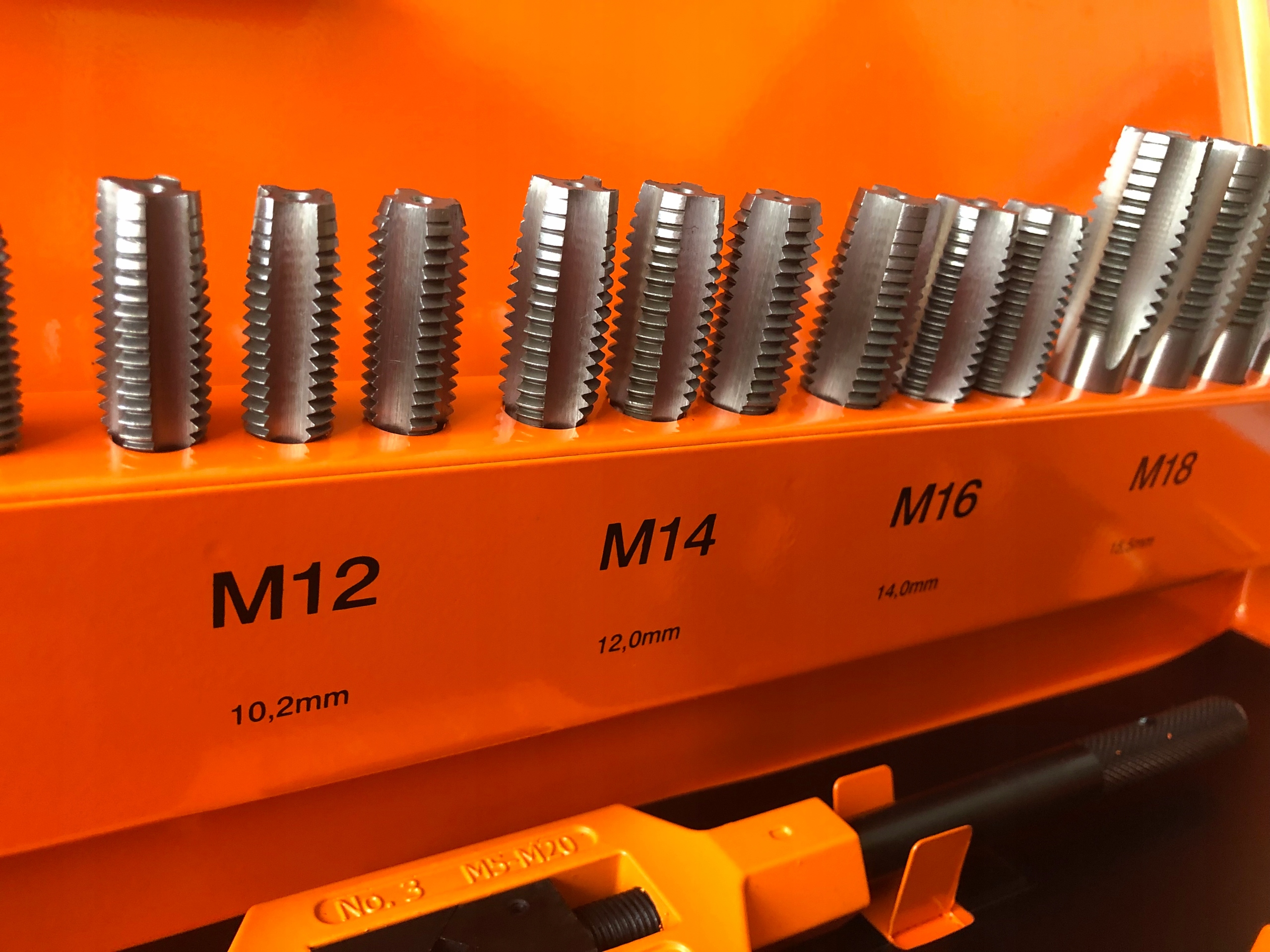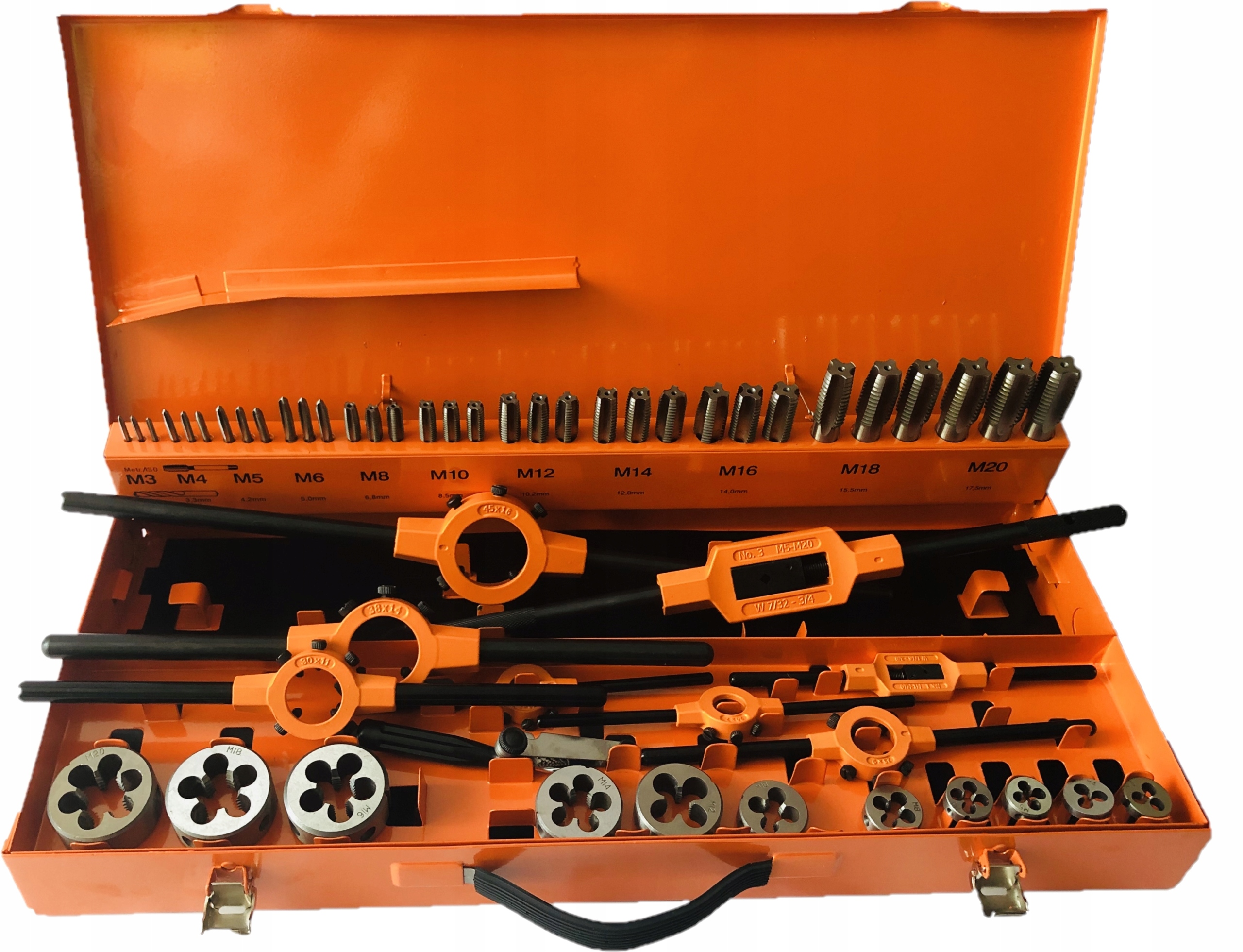 - Набір включає: мітчики, плашки, ручки для мітчиків, тримачі плашок, різьбомір і викрутку.