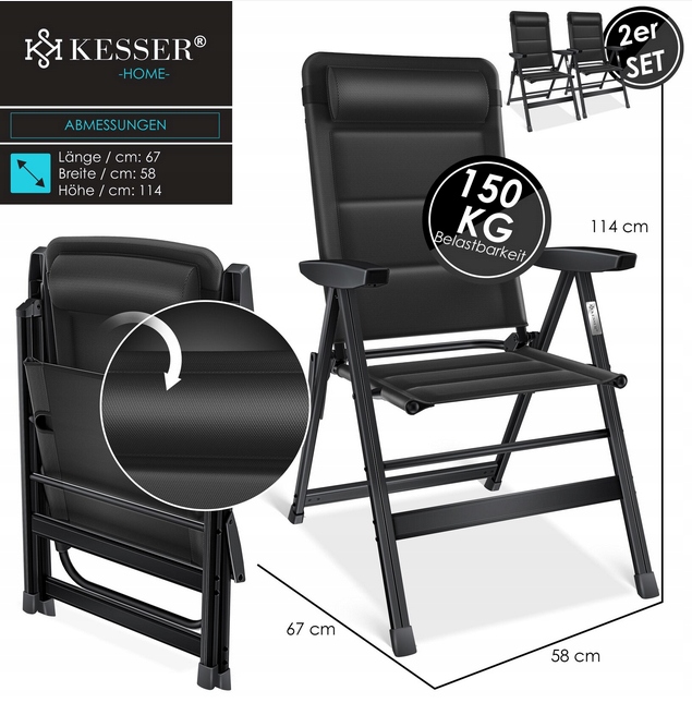 НАБІР САДОВИХ СТІЛЬЦІВ З 2 КОМПЛЕКТІВ, СКЛАДНІ КАМПАНІЙНІ СТІЛЬЦІ, РЕГУЛЮВАННЯ KESSER ЧОРНИЙ