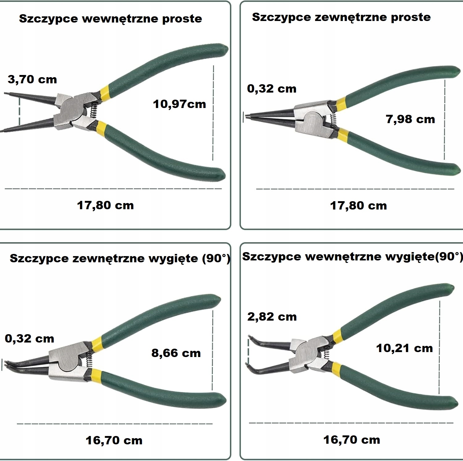 Набір містить дві пари прямих плоскогубців та дві пари зігнутих плоскогубців, що дозволяє точно узгодити інструмент до умов праці. Суцільна конструкція та ручки не -slip забезпечують зручність використання. Весь упакований в практичну обкладинку , полегшуючи зберігання та транспорт.